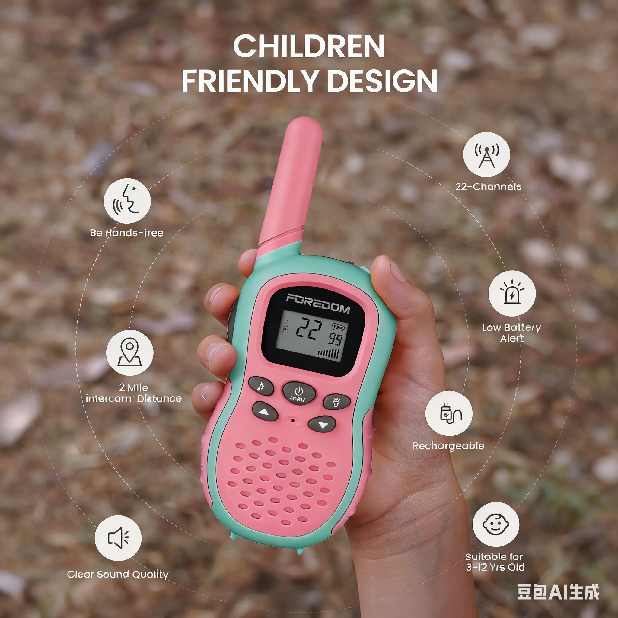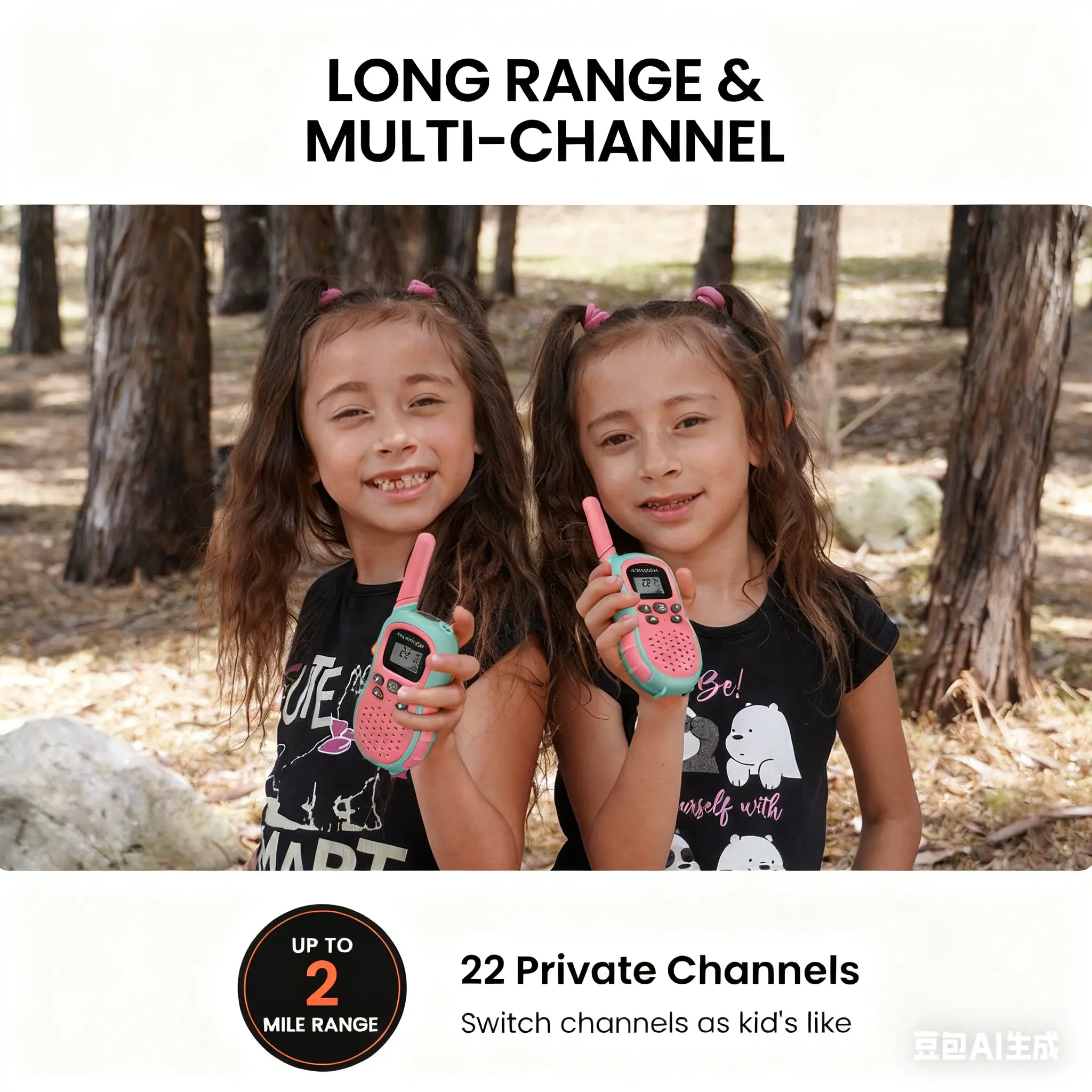 Clear sound, long range, and easy for kids to use. Perfect for outdoor adventures or playing around the house. Durable, fun design, and great battery life. Keeps kids connected and entertained for hours