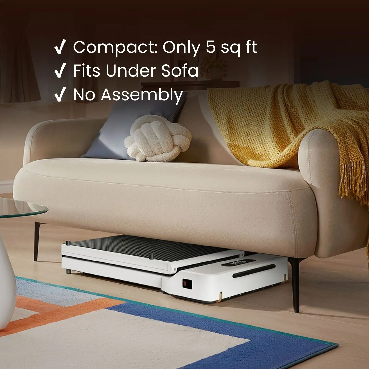 This was exactly the walking pad I was looking for. When folded up, it fits perfectly under the desk in my office. Works great and no assembly required!