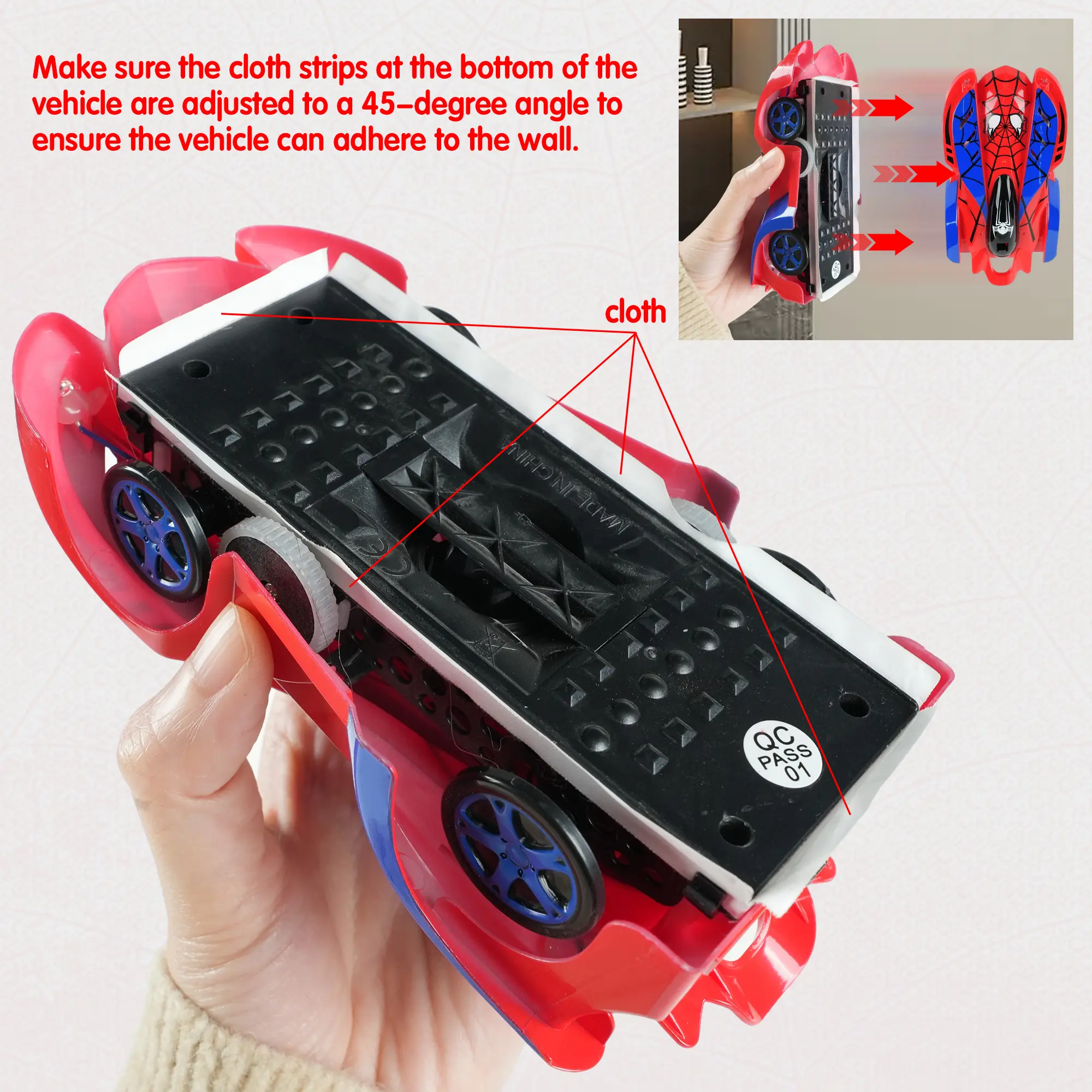 Before using the wall climbing car, make sure to adjust the bottom fabric strips outward by 90 degrees! This prevents them from sticking together and ensures smooth driving on walls and floors.