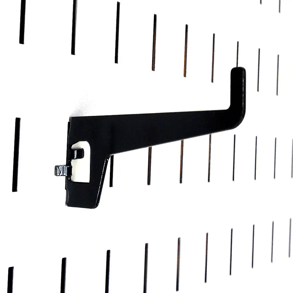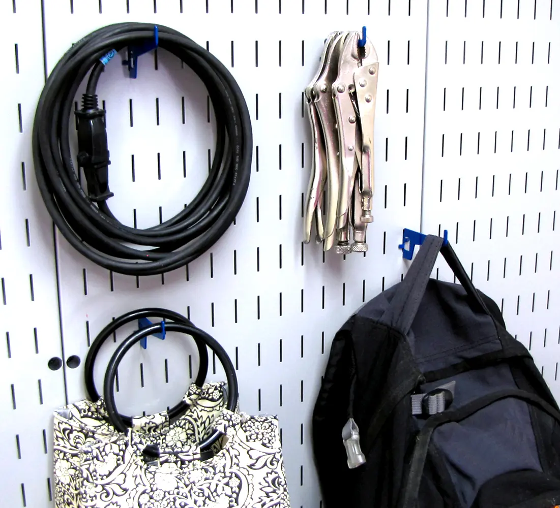 The Wall Control Pegboard 2-7/8in Long Reach Slotted Hook for Wall Control's Pegboard and Slotted Tool Board is great for garage tool storage and organization and is a great pegboard hook for hanging many items such as multiple boxed end wrenches, vise grip pliers, crescent wrenches, buckets, wire baskets, plastic baskets, backpacks, and many more household items. The Wall Control Pegboard 2-7/8in Long Reach Slotted Hook extends roughly 2-7/8in from the pegboard tool board and features a 1/2in tip which prevents tools and accessories from sliding off the peg hook. Wall Control Slotted Metal Pegboard Hooks feature a scratch and rust resistant baked-on finish. These more secure and stable toolboard hooks are for use with the slots found in Wall Control Metal Pegboard tool board panels only. Wall Control Slotted Toolboard hooks offer a patented engagement that requires two deliberate motions up-and-down to engage and disengage the hooks. This feature makes Wall Control Slotted Pegboard hooks less likely to fall out of the tool board than conventional peg hooks that can easily fall off when tools are removed. Although Wall Control Metal Pegboard Panels will accept conventional 1/4in pegboard accessories as well as Wall Control Slotted Accessories the Slotted Secure Tool Board Hooks included in this pack are only for use with Wall Control Metal Pegboard Panels and Tool Boards. Wall Control Pegboard Products are Made in the USA