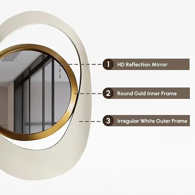 Crafted with a gorgeous irregular shape and a stunning white and gold geometric design, this mirror catches the eye. Its glass material ensures durability and an elegant look. Perfect for functional or decorative purposes, it adds modernity to your living space.
