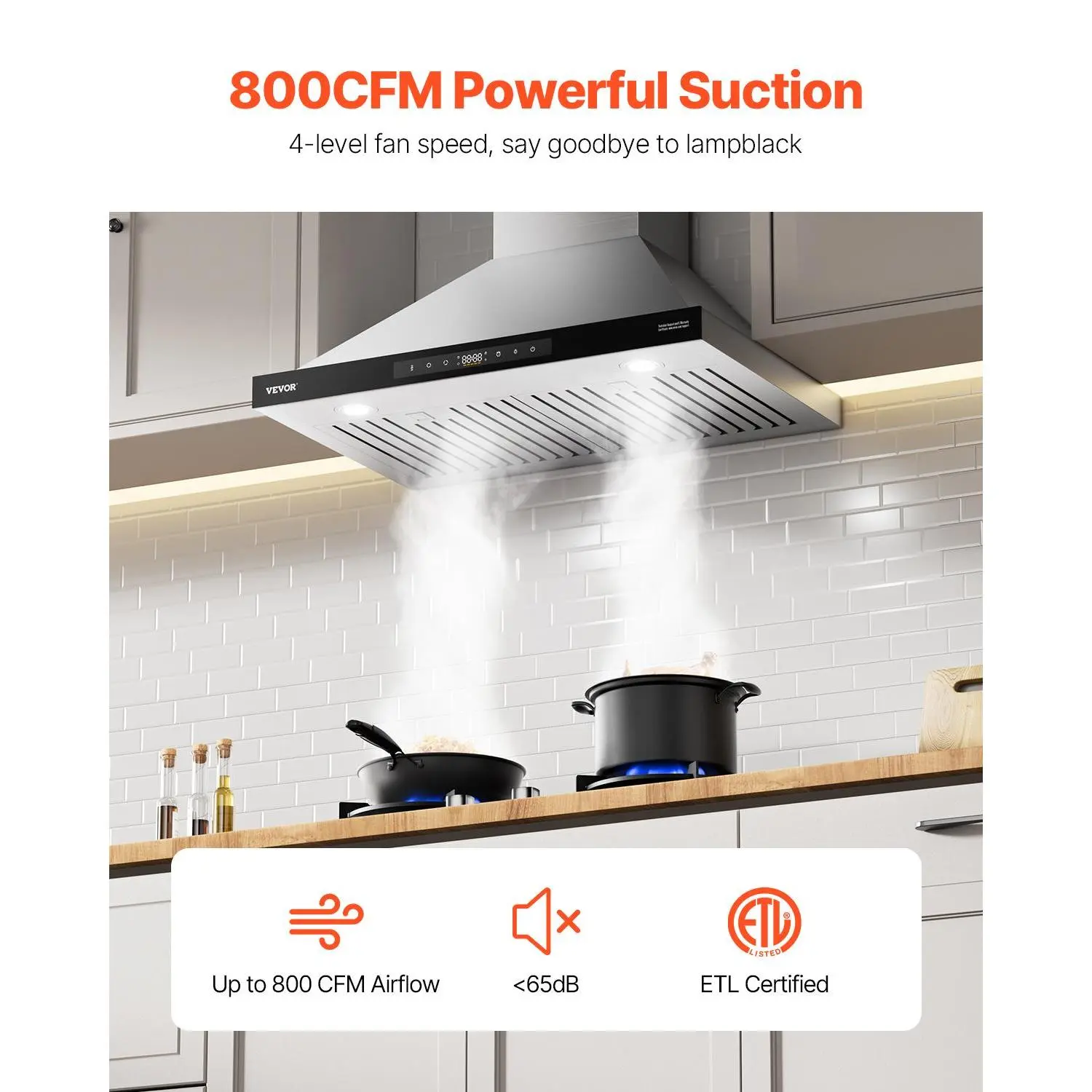 • 800CFM Powerful Suction: Enjoy efficient air purification with our wall mount range hood's robust 800 CFM airflow. Featuring a 4-level fan speed control, it effectively eliminates smoke and odors from your kitchen while maintaining a quiet operation of less than 65dB. ETL certified for safety and performance.