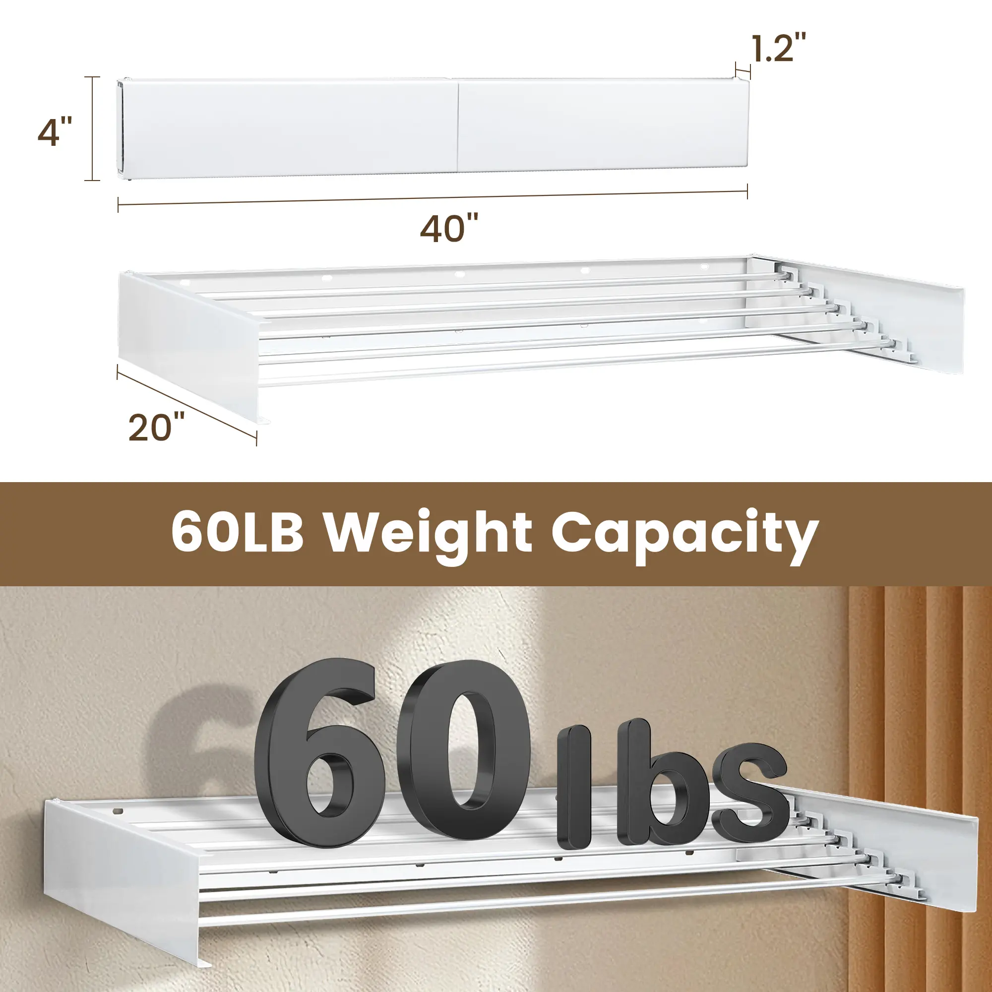 Wall Mounted Clothes Drying Rack 40" Folding Laundry Drying Rack, Collapsible Hanging Rack for Bathroom and Laundry, Supports up to 60lbs for Maximum Space-Saving Efficiency