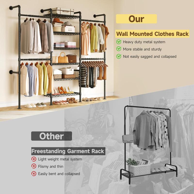 ·Sturdy & Collapse-Resistant Construction: Built with high quality matte powder coated metal pipes, this clothing rack is sturdy and stable, not easy to deform to ensure durability, and is equipped with a secure wall mounted system that won't shake or collapse to avoid accidental tipping