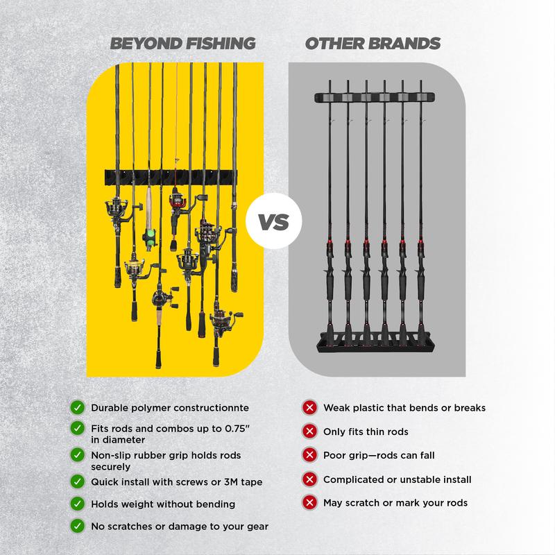 FITS THE RODS YOU ACTUALLY USE - From lightweight panfish rods to beefy saltwater setups, our fishing rod rack handles diameters from 0.15"–0.75" with zero hassle. Whether you're casting, spinning, or ice fishing, this rack fits your full arsenal.