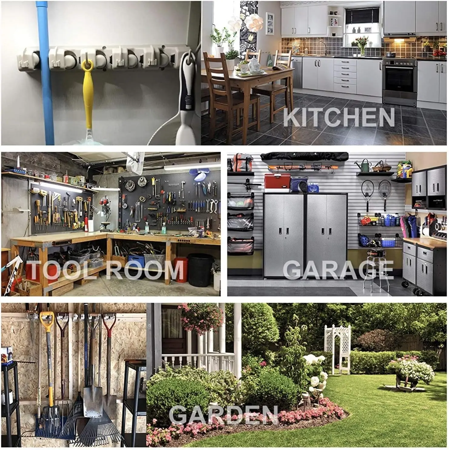 ·FOR INDOORS OR OUTDOORS – Tidy up any of your brooms, mops, rakes, shovels, cleaning, gardening supplies with just one tool organizer. Our broom hanger is perfect for the kitchen, closet, garage, office or commercial use. Thanks to its weatherproof design, our holder can even be used outdoors or on the shed for your garden tools.