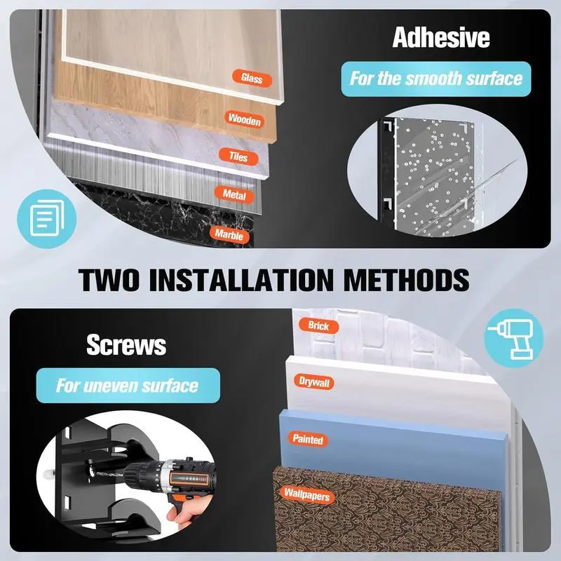 TWO INSTALLATIONS METHODS: Hat Rack for wall can be installed in two ways: self-adhesive and screw drilled holes. You can choose the appropriate method according to the usage scenario. Note: Due to the firm sticking, please confirm the direction and position before sticking, the part of the wall plate with holes is the top to avoid forming repeated tears·