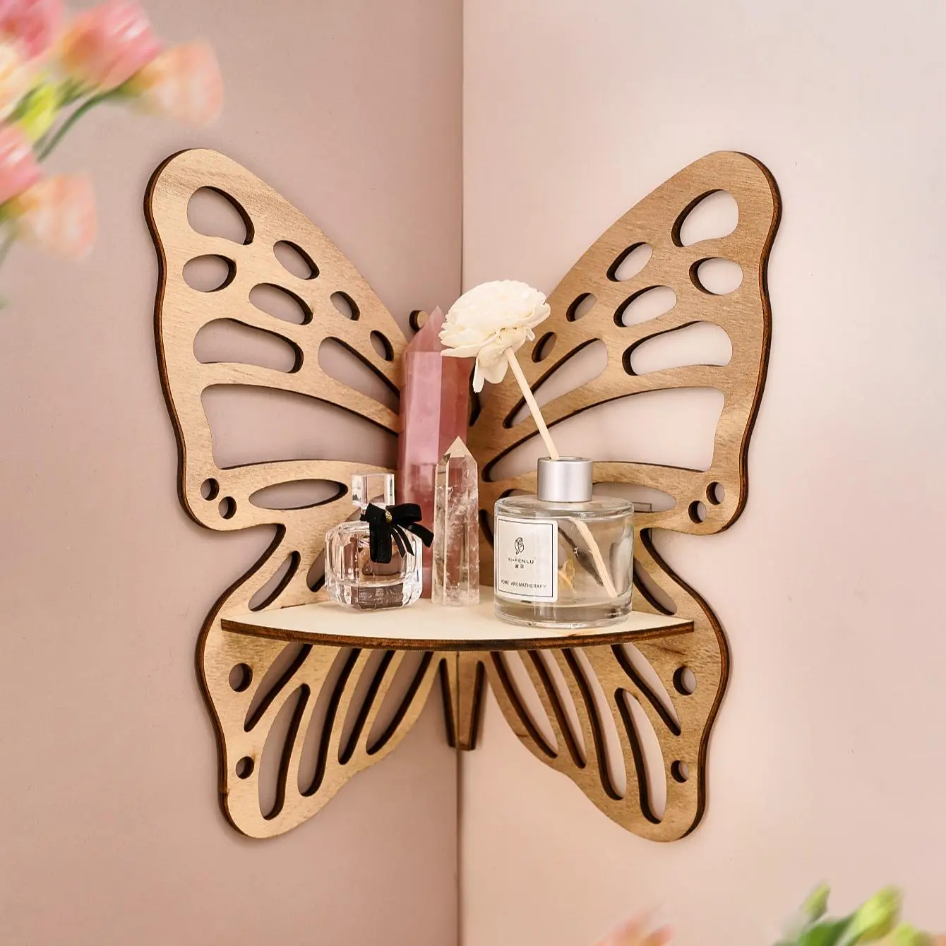 5. Wooden Butterfly Shaped Wall Mounted Storage Rack, 1 Count Hollow Out Design Wall Hanging Shelf, Wall Decor for Home Living Room Bedroom, Wall Mounted Organizer