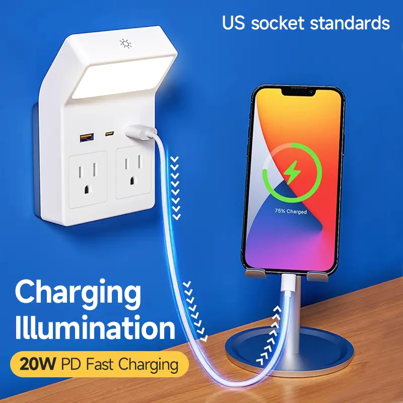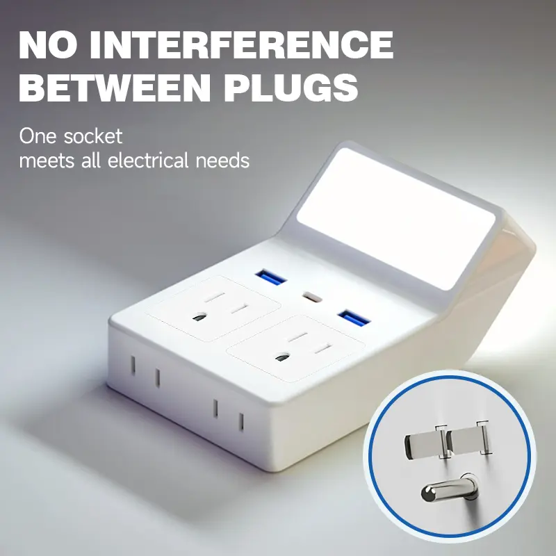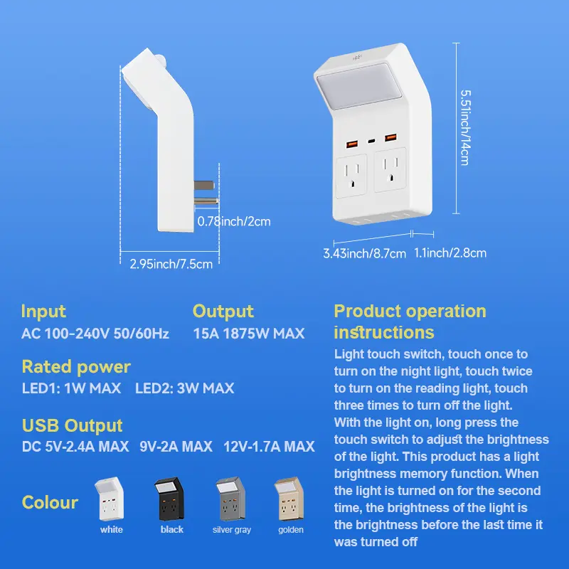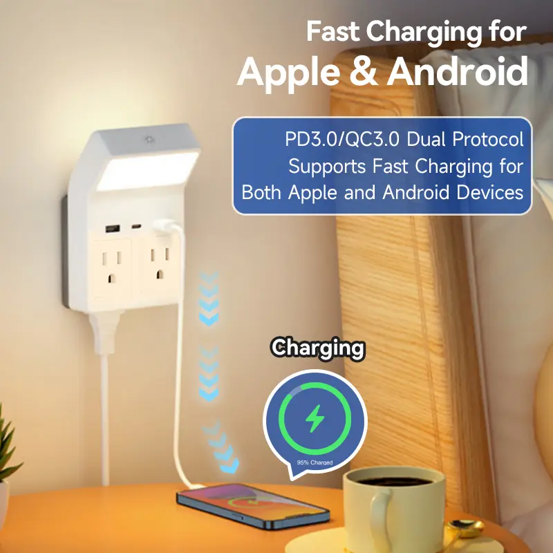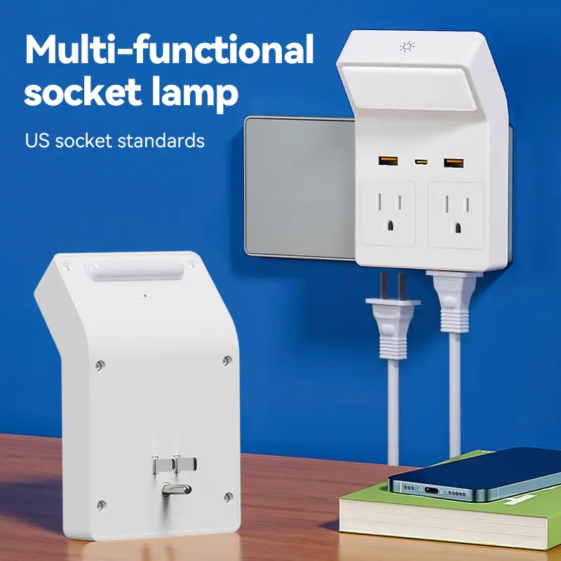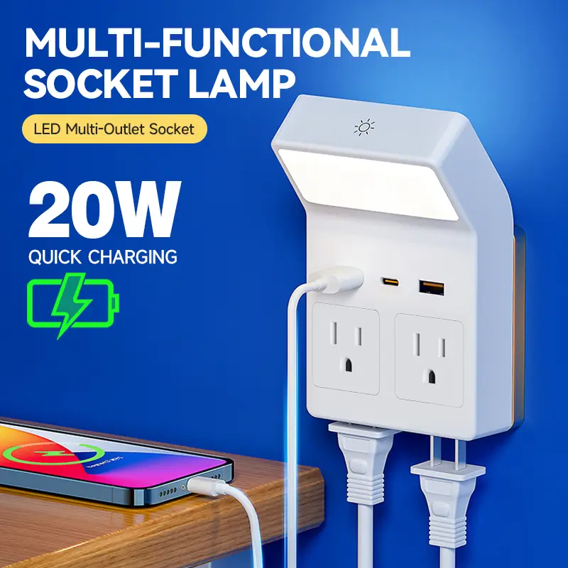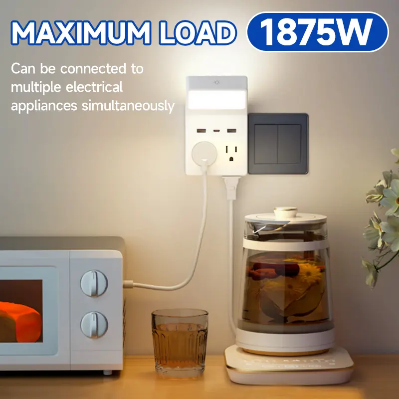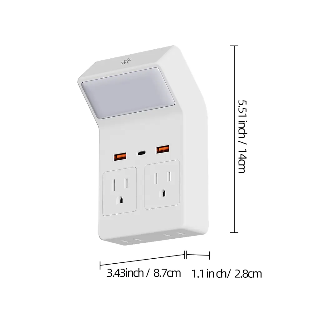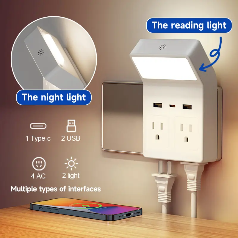 Wall outlet with night light, multi-functional socket converter with protection and extension, featuring 4 AC power sockets, 2 USB ports, and 1 Type-C port, suitable for home, office, and travel use plug