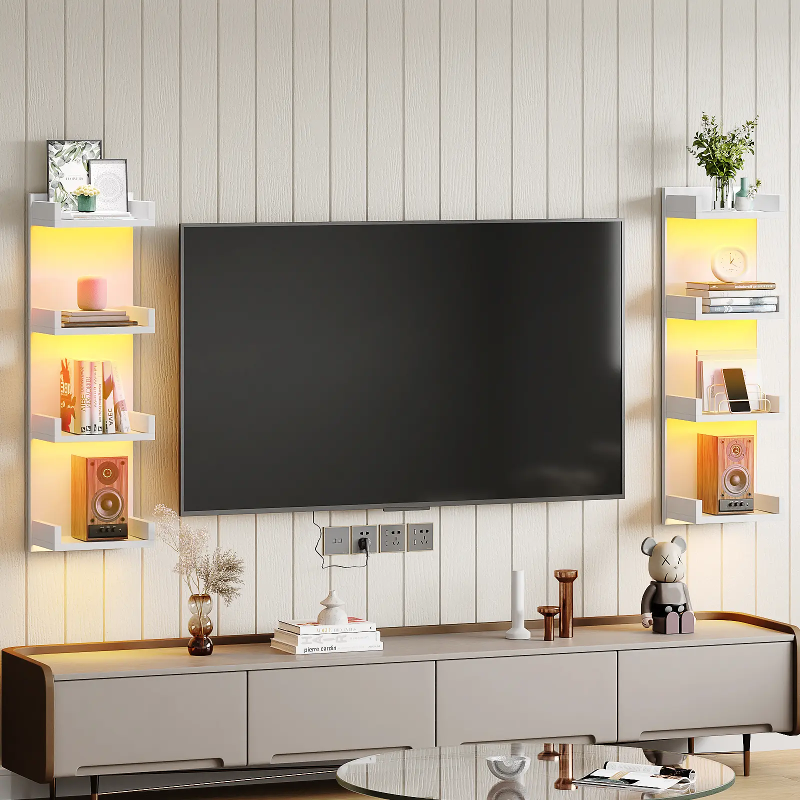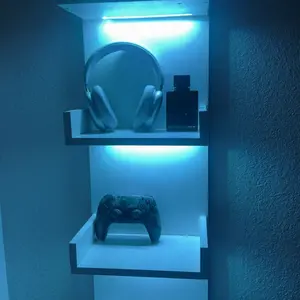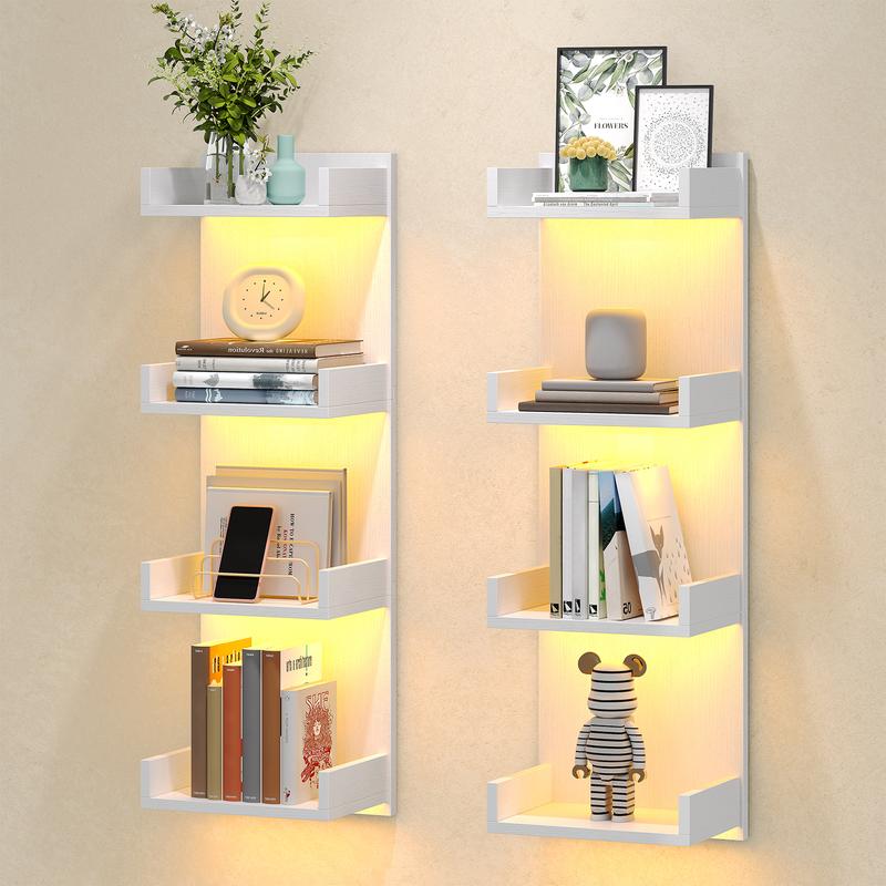 Each floating shelf has an LED strip underneath, supporting multiple colors, modes, and brightness levels.