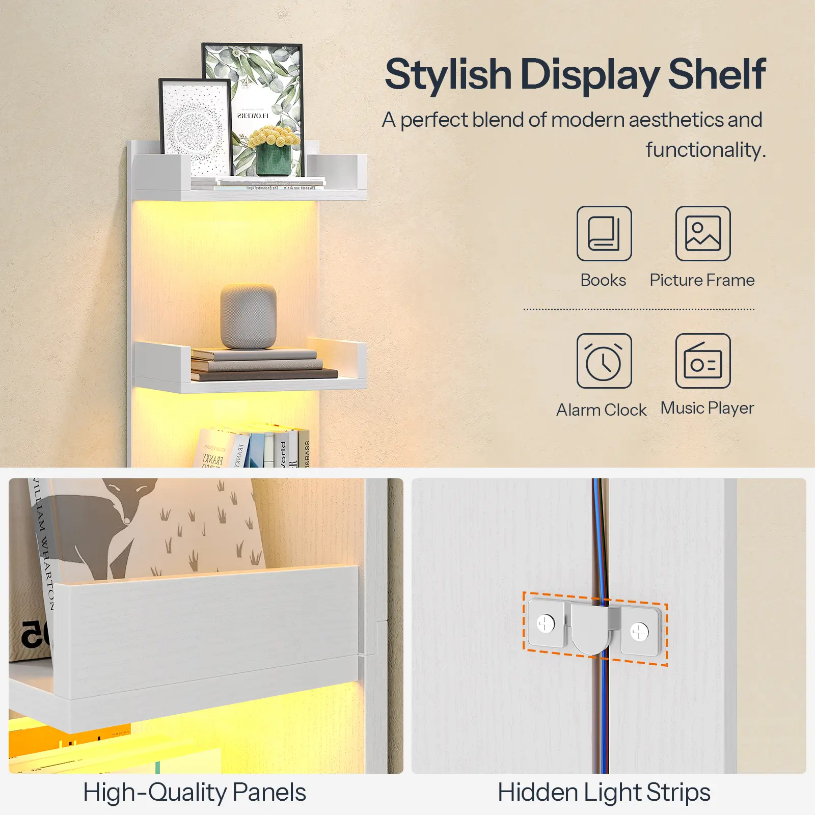 Combining practicality with aesthetics, this floating shelf with LED lights seamlessly integrates into various settings, including the living room, bedroom, study, foyer, or hallway, enhancing the overall ambiance and elevating your taste.