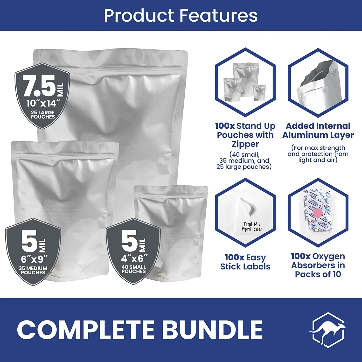 ·3 in 1 BUNDLE - Includes 100 5 or 7.5 Mil thick, heat-sealable, Mylar bags, 100 oxygen absorber packets (400cc each) and 100 identification sticker labels. Perfect for pantry items like flour, sugar, rice, freeze dried or dehydrated foods.