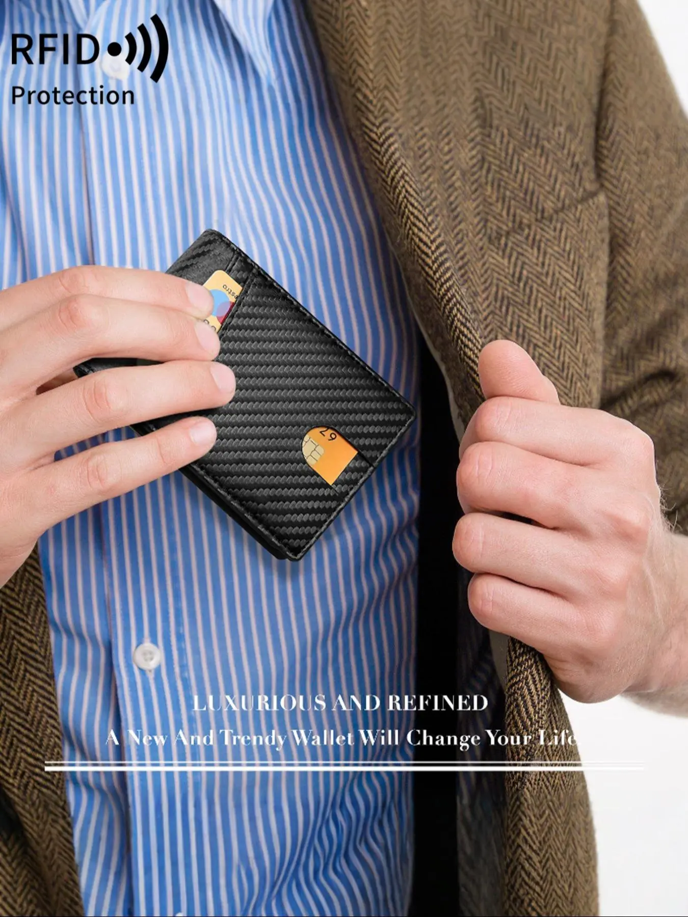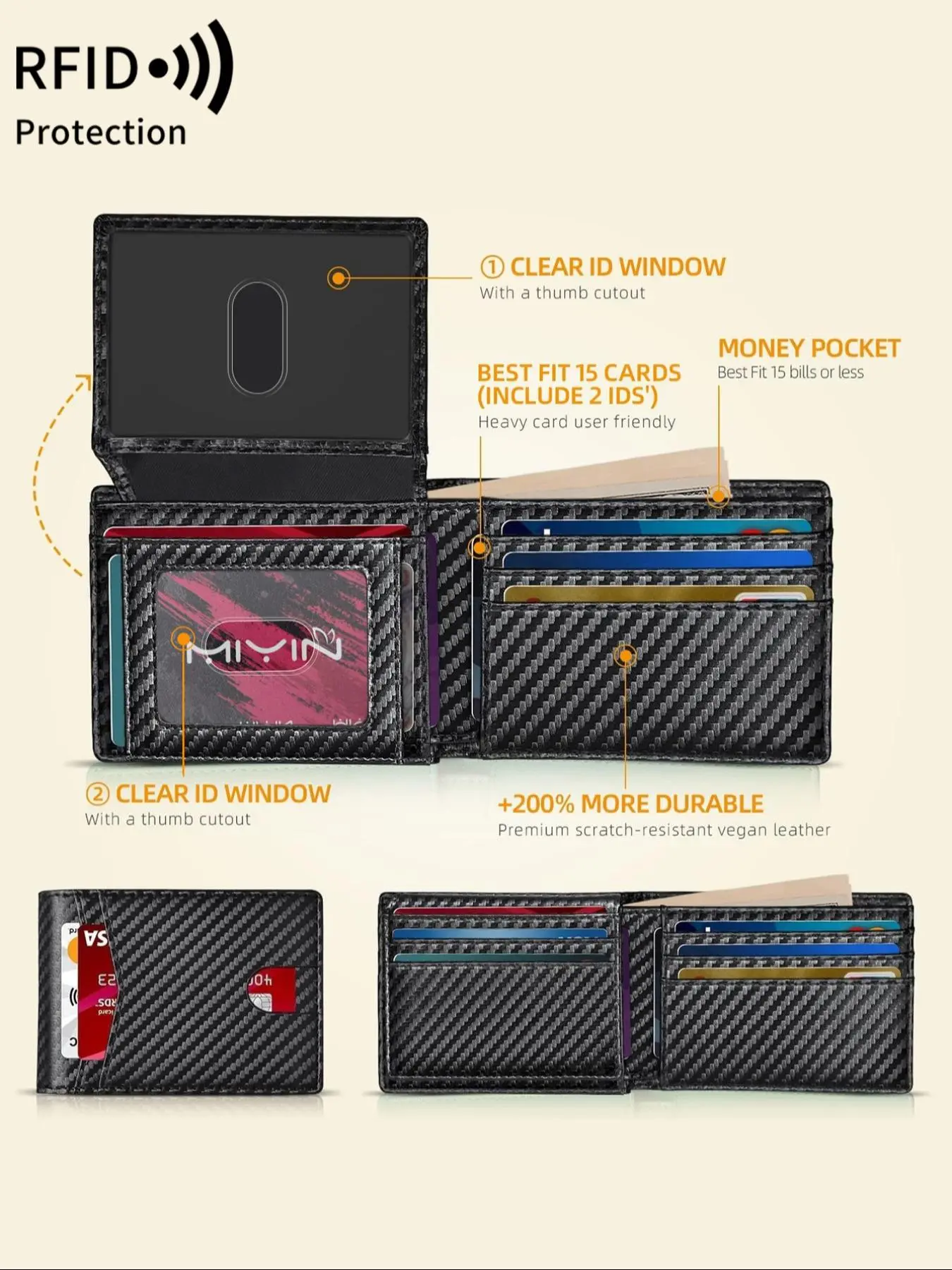 【Microfiber Material】: Crafted from high-quality microfiber leather, this wallet offers a sleek appearance and impressive durability for daily use.