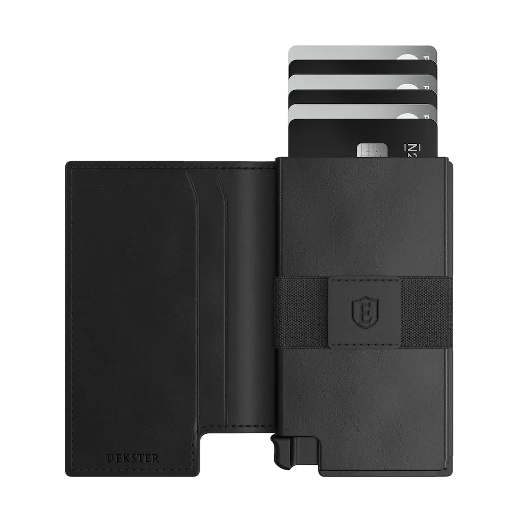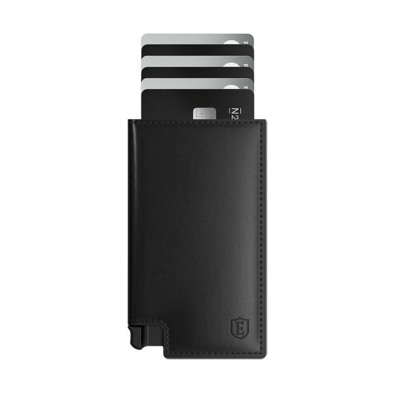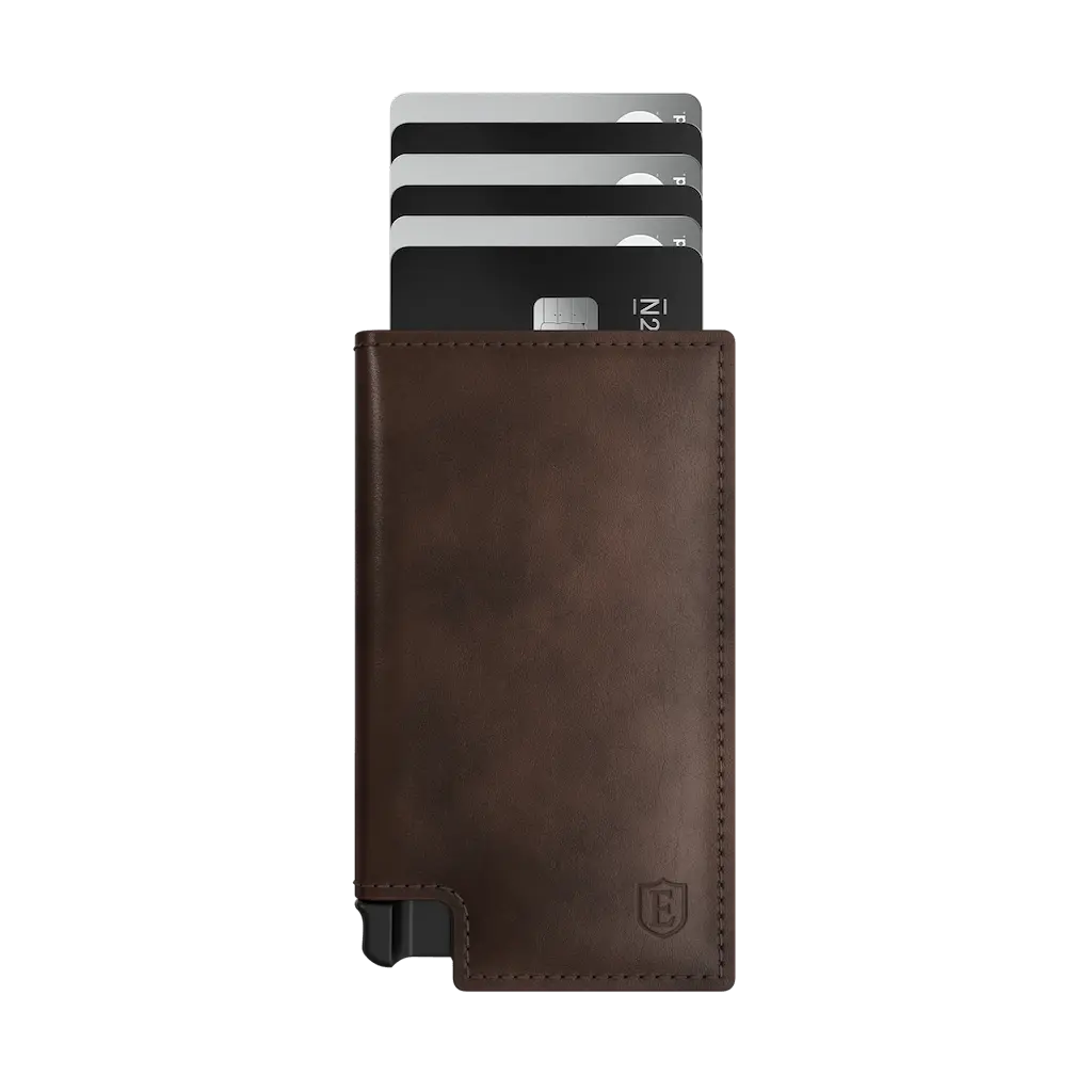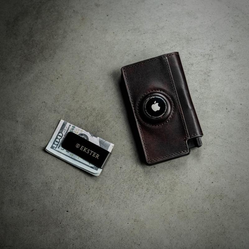A minimalist leather wallet designed for fast access and slim storage. The built-in aluminum cardholder fans out your cards at the click of a button and protects them against skimming. Now with a custom pocket for your AirTag so you can track it with the Find My app.(Airtag not included).