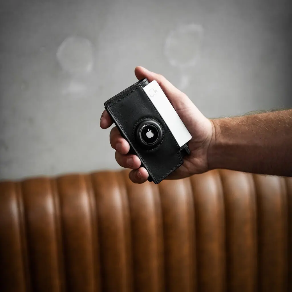 The AirTag wallet is made from premium top-grain leather, which is durable and ages beautifully over time. The inner cardholder is made from space-grade aluminum. The silicon AirTag slot is designed for a snug and secure fit.