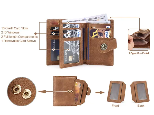 This slim wallet offers great storage. It has 10 card slots (1 is an ID window), a removable card sleeve with 1 card slot and 1 ID window, 1 full - length compartment, and 1 zipper coin pocket. It remains closed and flat even when full. The bill section can hold up to 30 dollar bills. It's well - organized and fits easily in your handbag or pocket.