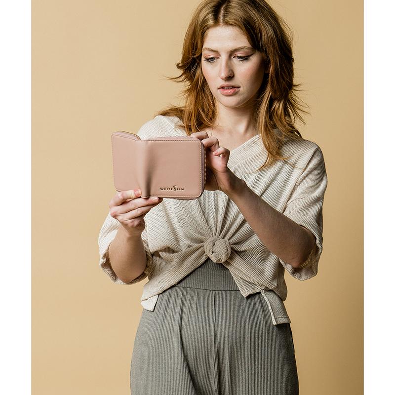 The Starla is your new go-to wallet! It has space for unfolded cash, a zippered coin pocket, a clear window slot for your ID, four card slots, and an open pocket with space for more cards, receipts, etc. The Starla is made to fit nicely inside your Ara crossbody, or inside one of the pockets in your larger White Elm bag.