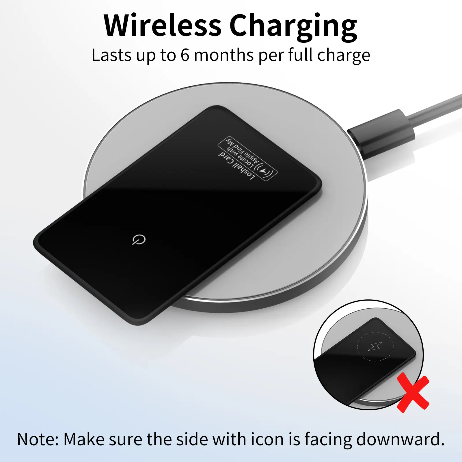 Wireless Charging Support: You can use any wireless charger to charge the smart card tracker, and it can be used continuously for up to 6 months after a full charge. You can see the power level of the wallet finder in Find My. When charging, the wallet card always lights up red. When fully charged, it lights up green.