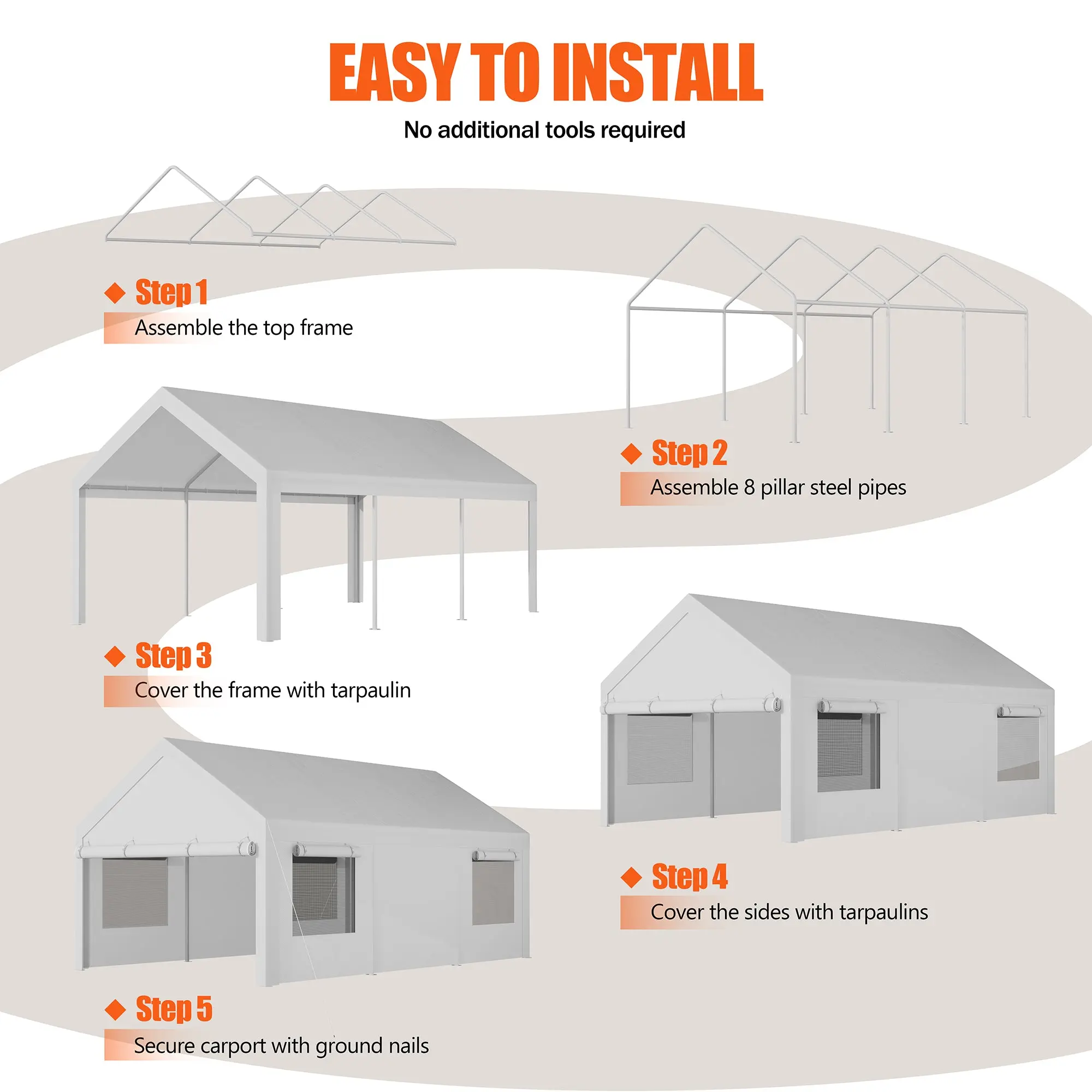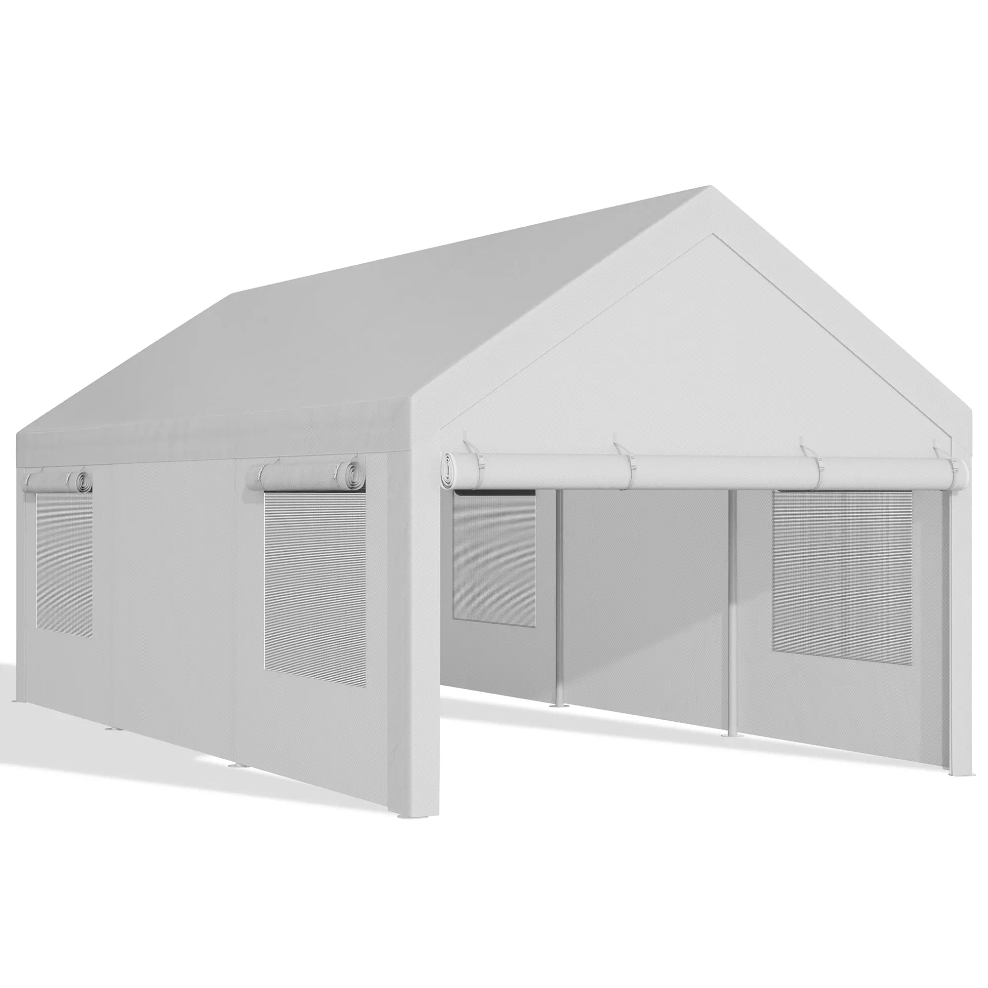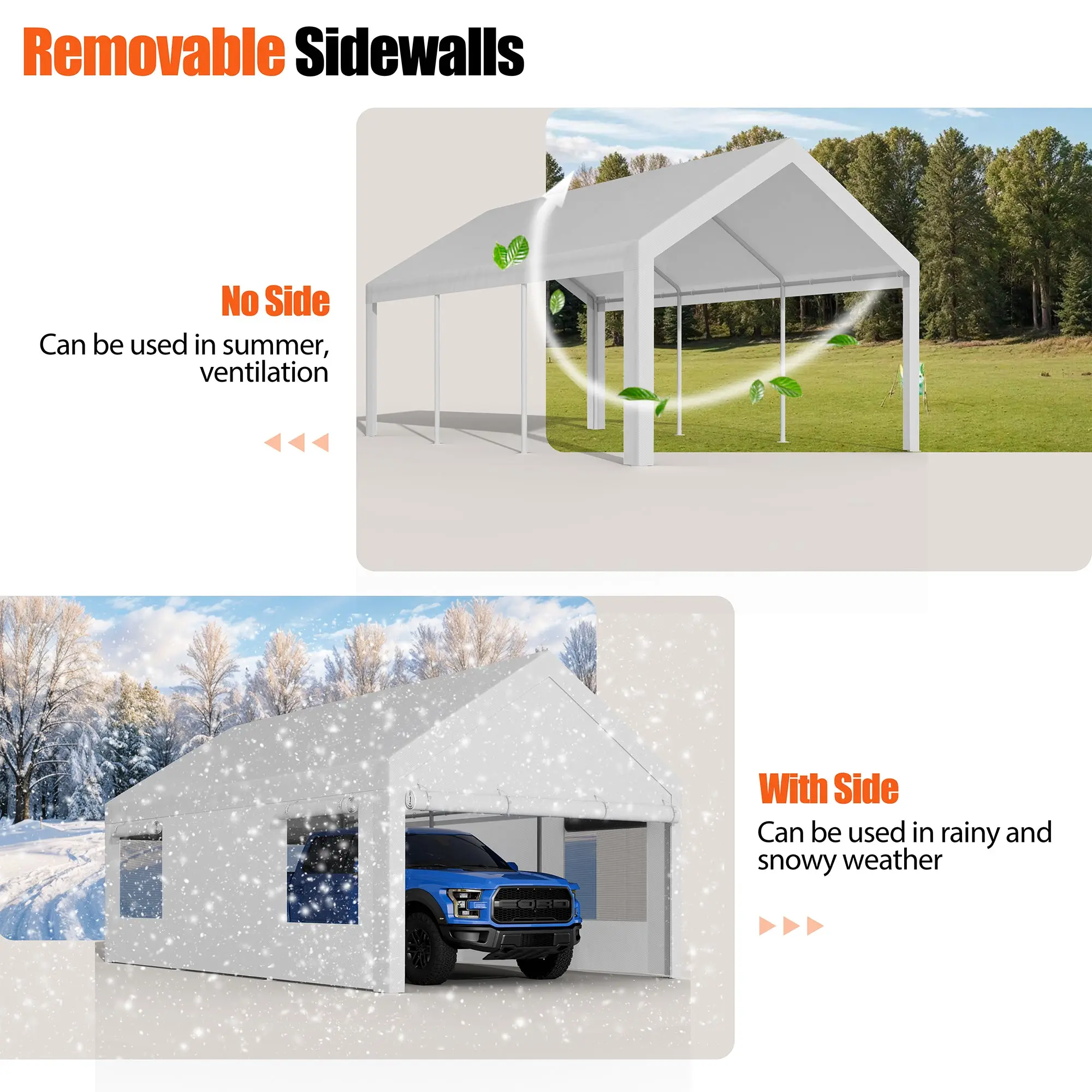 ·【Removable Sidewalls Window and Doors】This carport shelter has 2 removable sidewalls with Roll-up Ventilation Windows. It can help with airflow, and prevent moisture. It also has two removable doors with zippers. You can roll the doors up or down as you wish. Or remove all the sidewalls and doors, only leave the canopy cover on for outdoor activities.