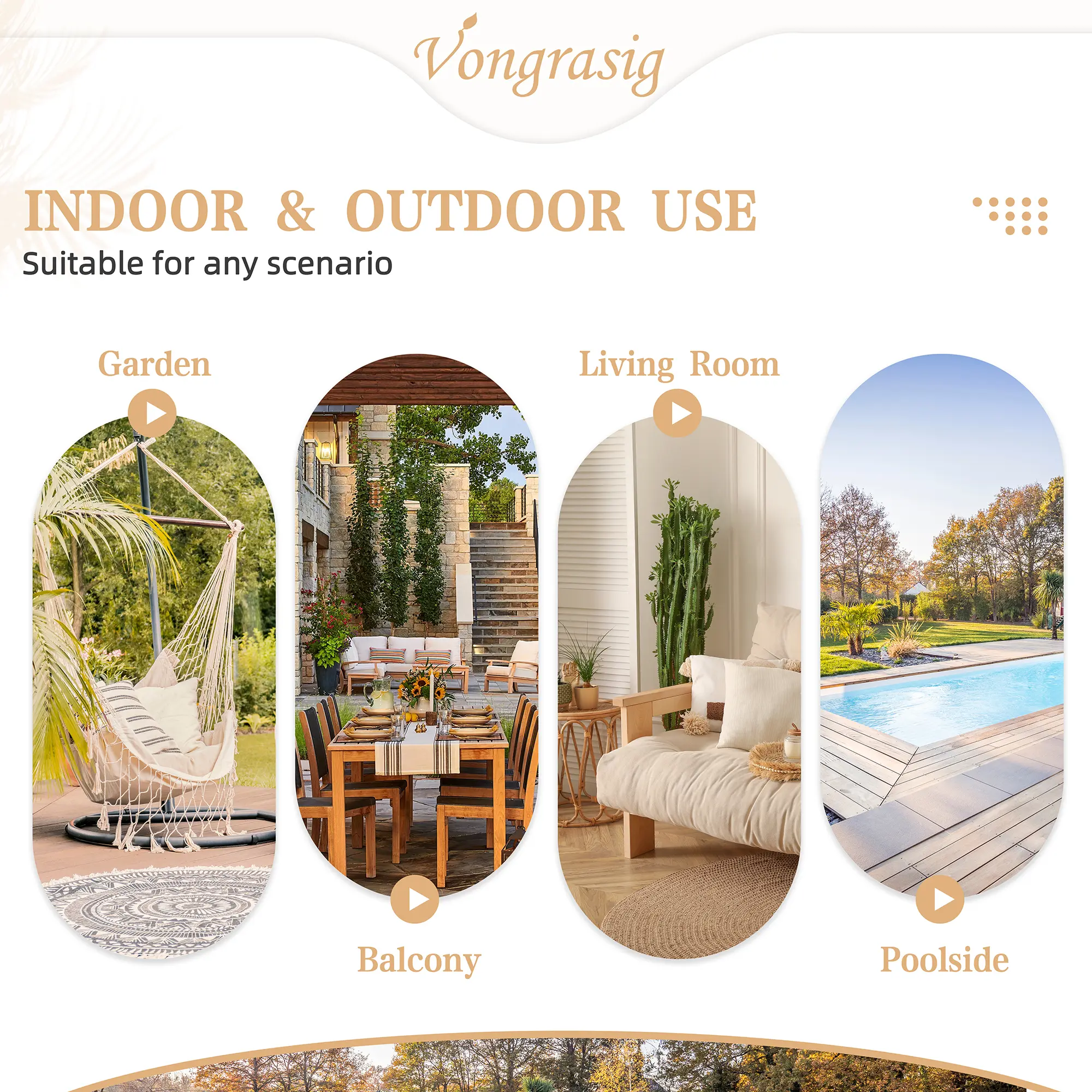 ·Not only for outdoor: It is not only an outdoor piece of furniture, but also complements the indoor atmosphere! Its elegant and modern design is ideal for outdoor Spaces such as backyards, terraces, balconies, porches, terraces, gardens and poolside. However, it can also easily bring a romantic, laid-back atmosphere to an interior space such as a living room or bedroom.