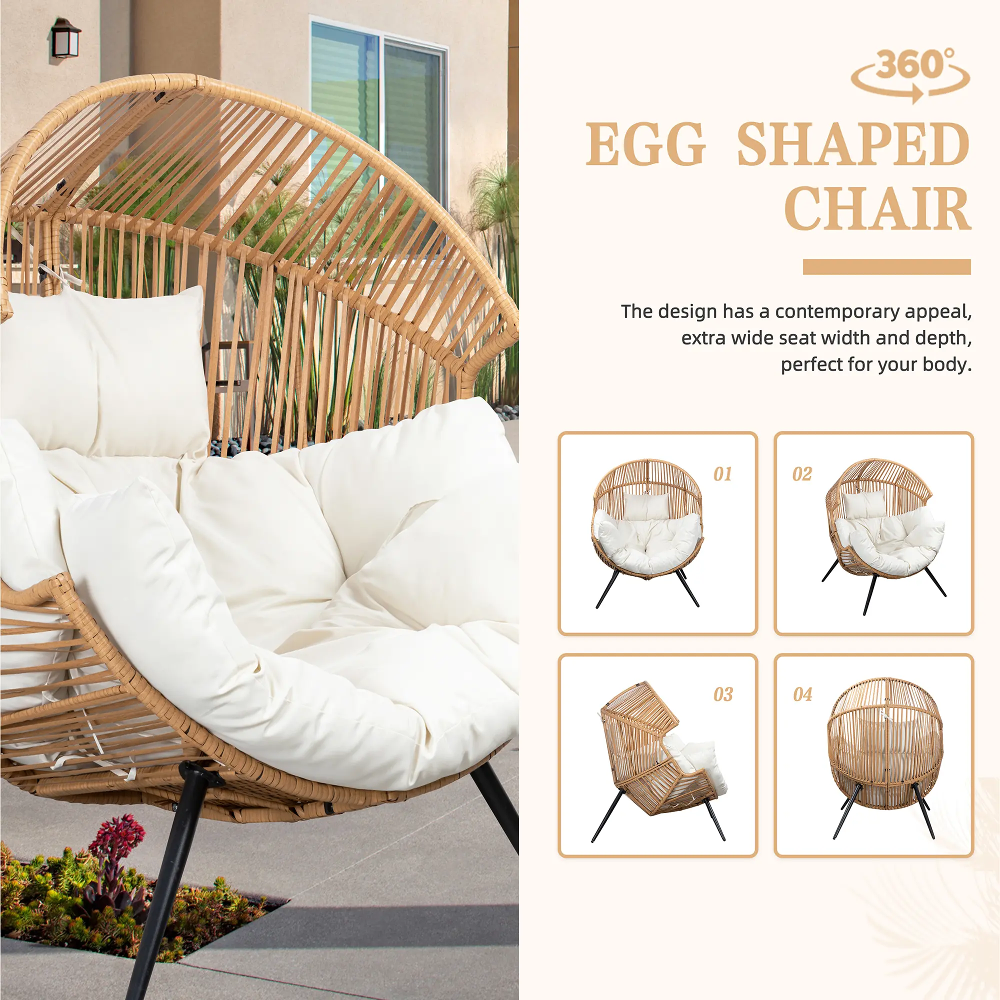 ·Unmatched comfort:This outdoor chair comes with a soft seat and backrest cushion that is not only washable, but also breathable and comfortable. The soft curves and padding are like a warm embrace of your body, providing you with excellent support. Whether you're looking for a cozy sanctuary to read alone or a place to unwind after a hard day, this egg chair is the ultimate getaway.
