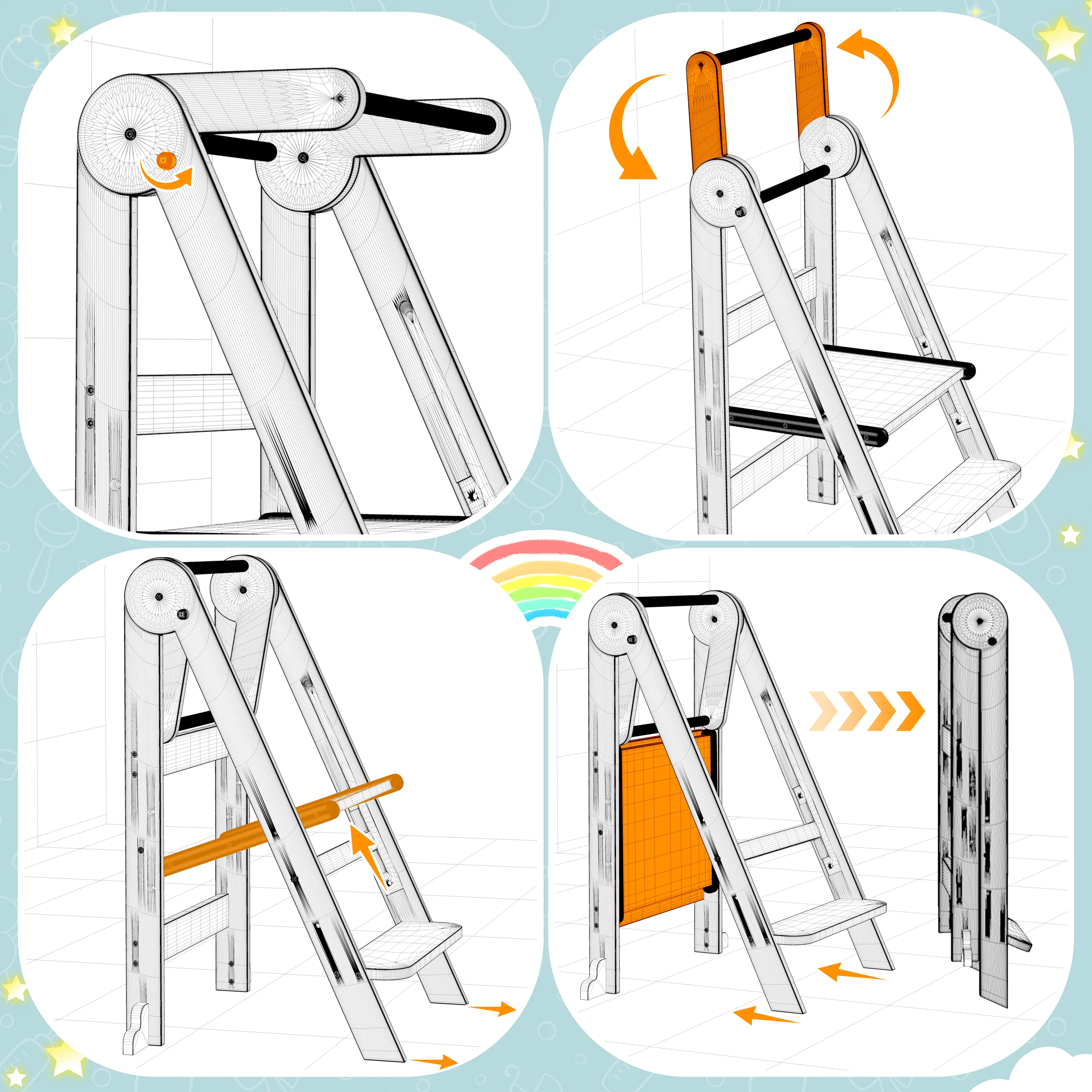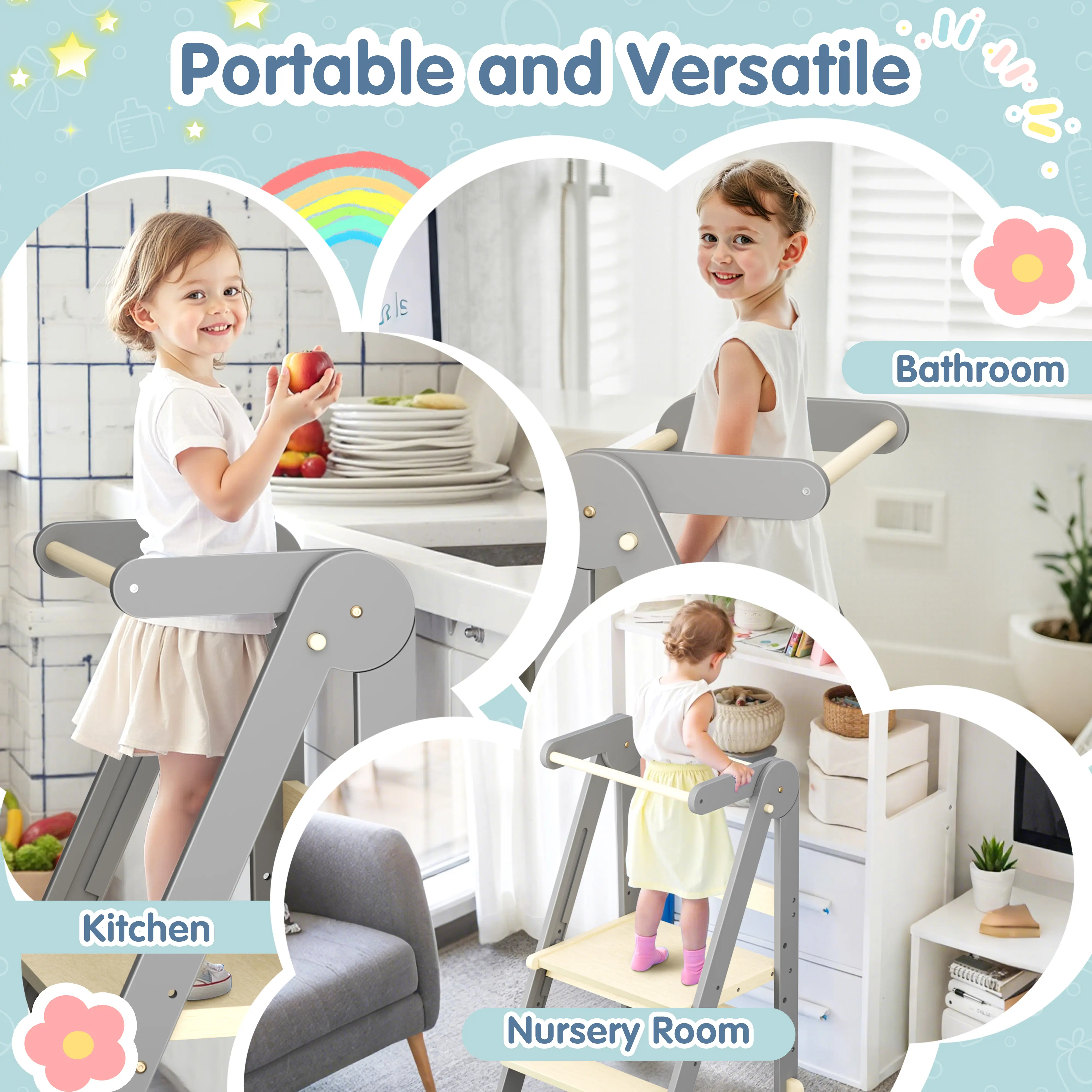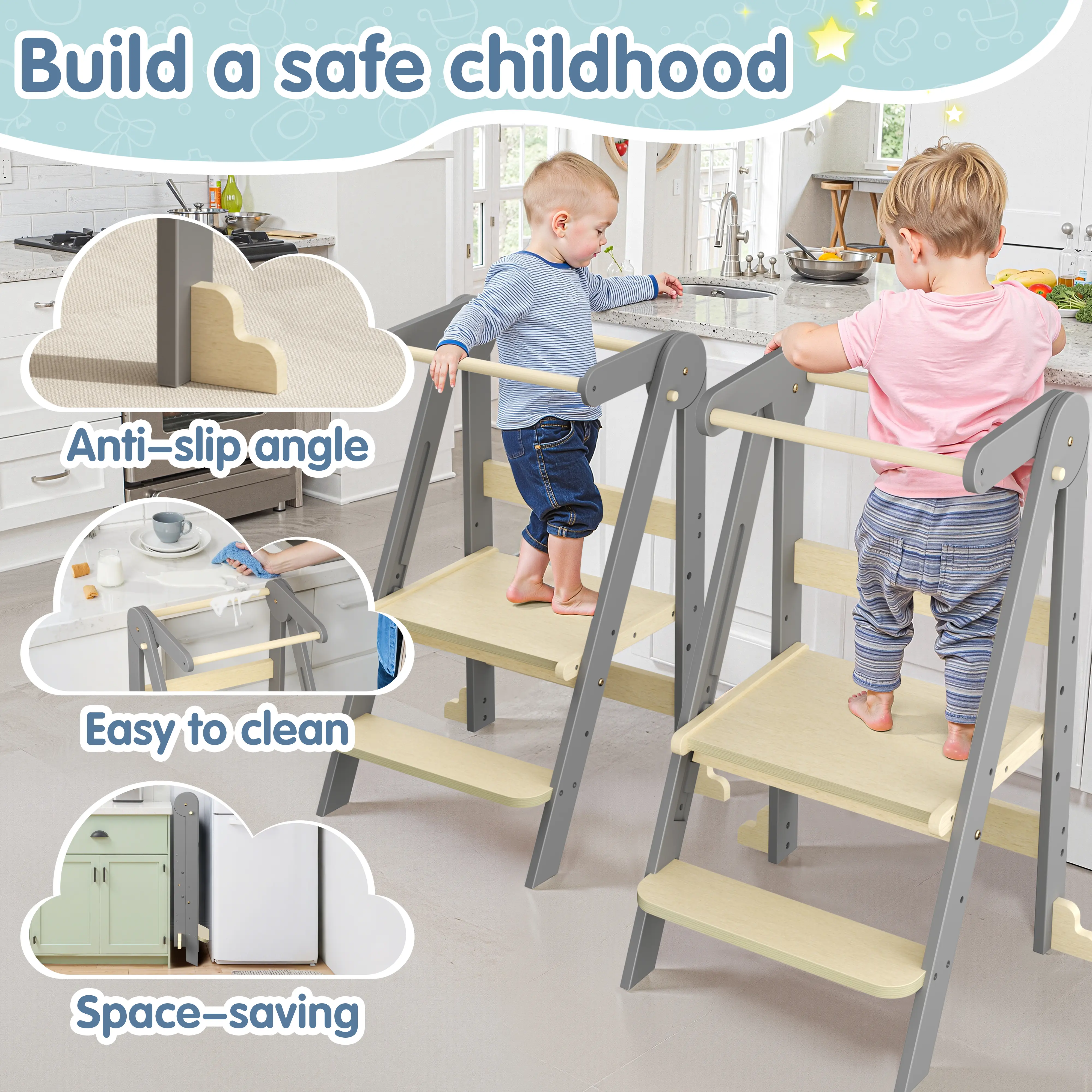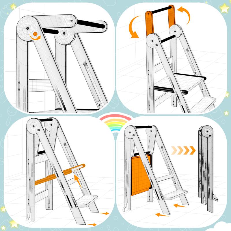 4. Foldable & Space-saving Design: Easily fold the toddler tower and tuck it away under furniture like beds, sofas, or in pantry corners. Perfect for small spaces!