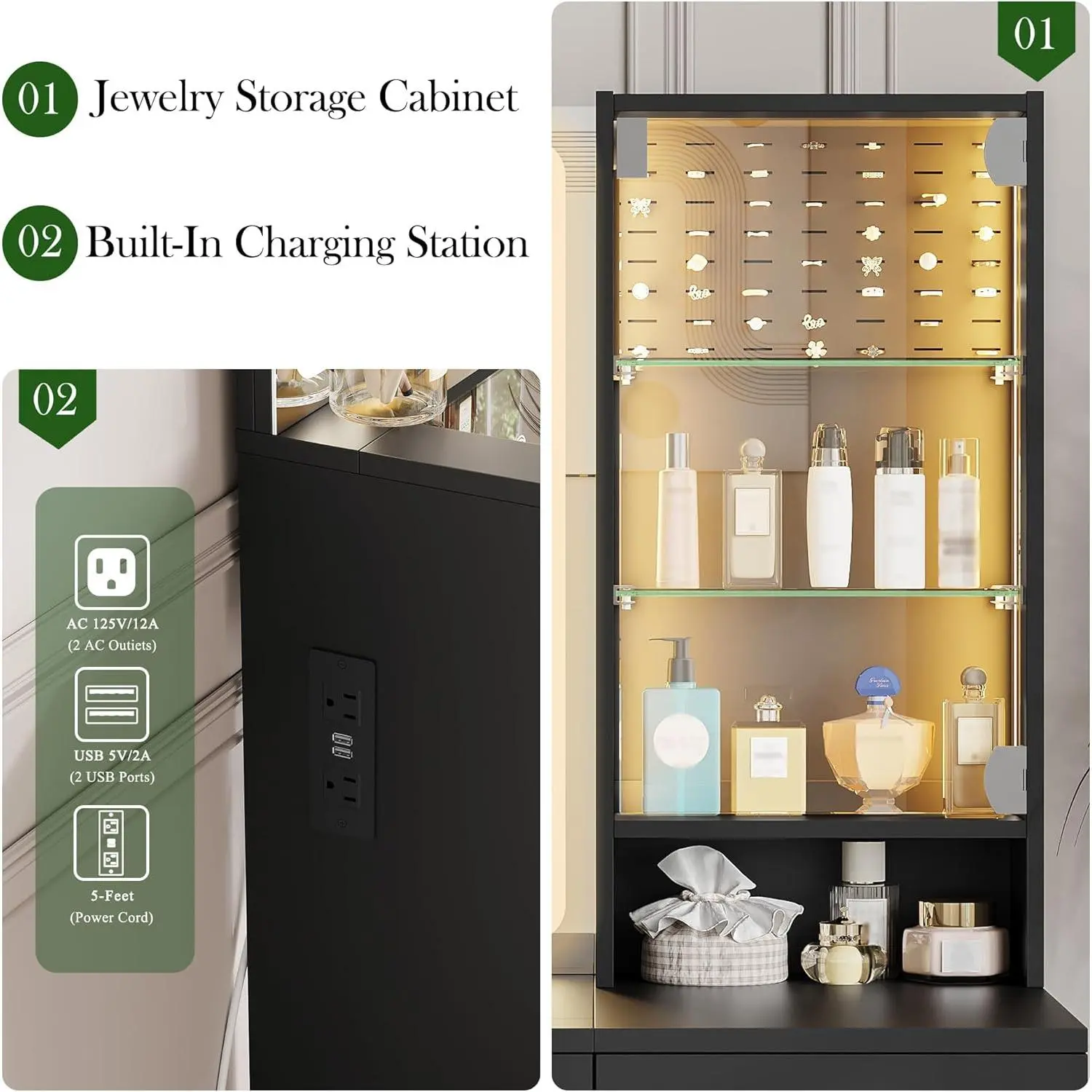 5. wanan 41" Vanity Desk with Glass Top, Black Vanity with Mirror and Lights, Power Outlet, Jewelry Storage, 3 Adjustable Lighting Modes, Makeup Vanity with 2 Drawers for Bedroom