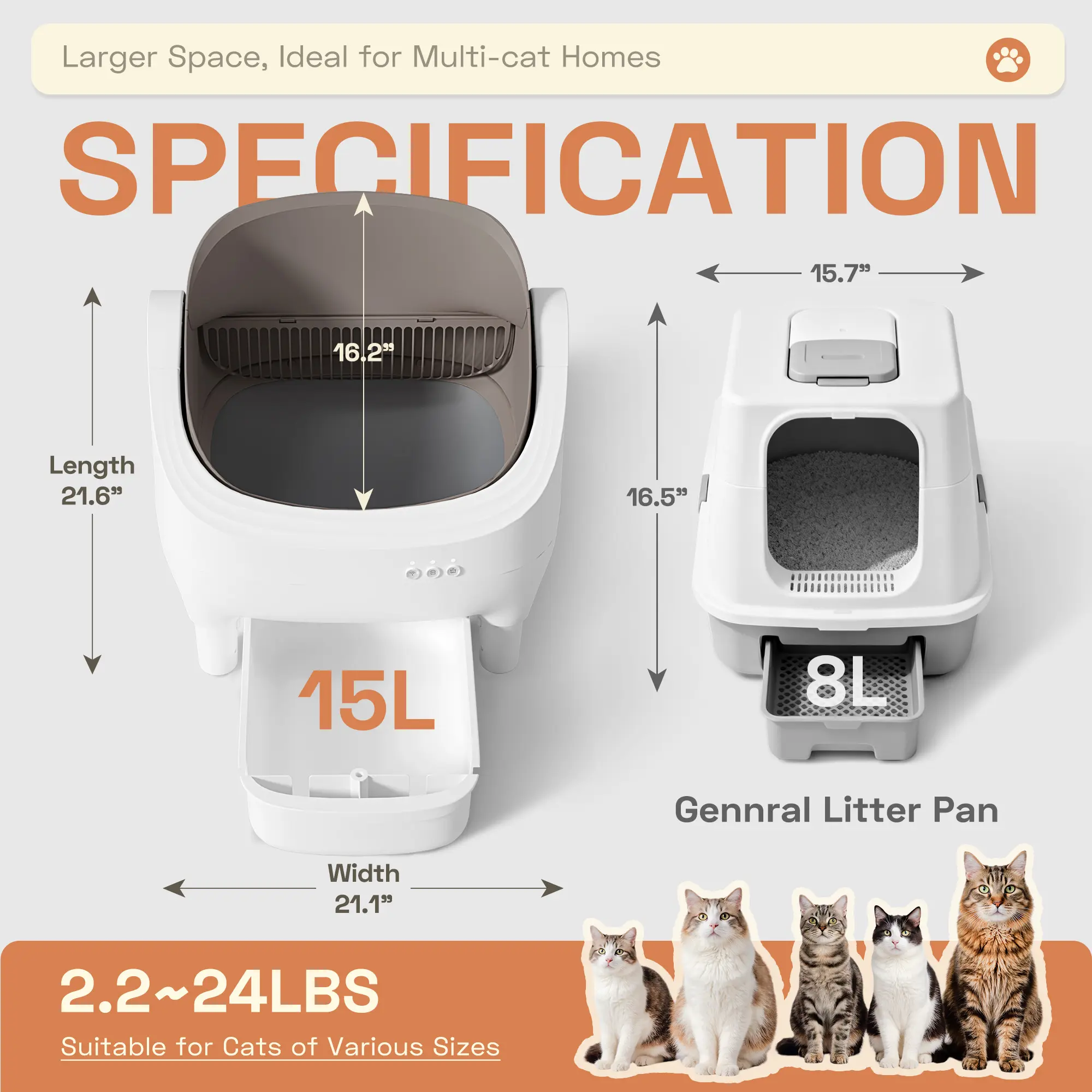 ·High-Capacity Efficiency: A 15L waste bin reduces refill frequency, supporting up to 7 days of use for one cat. Compatible with bentonite and mineral litters.