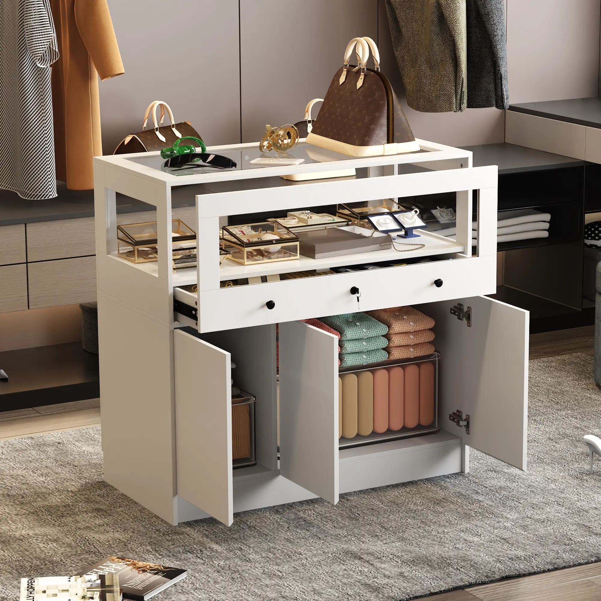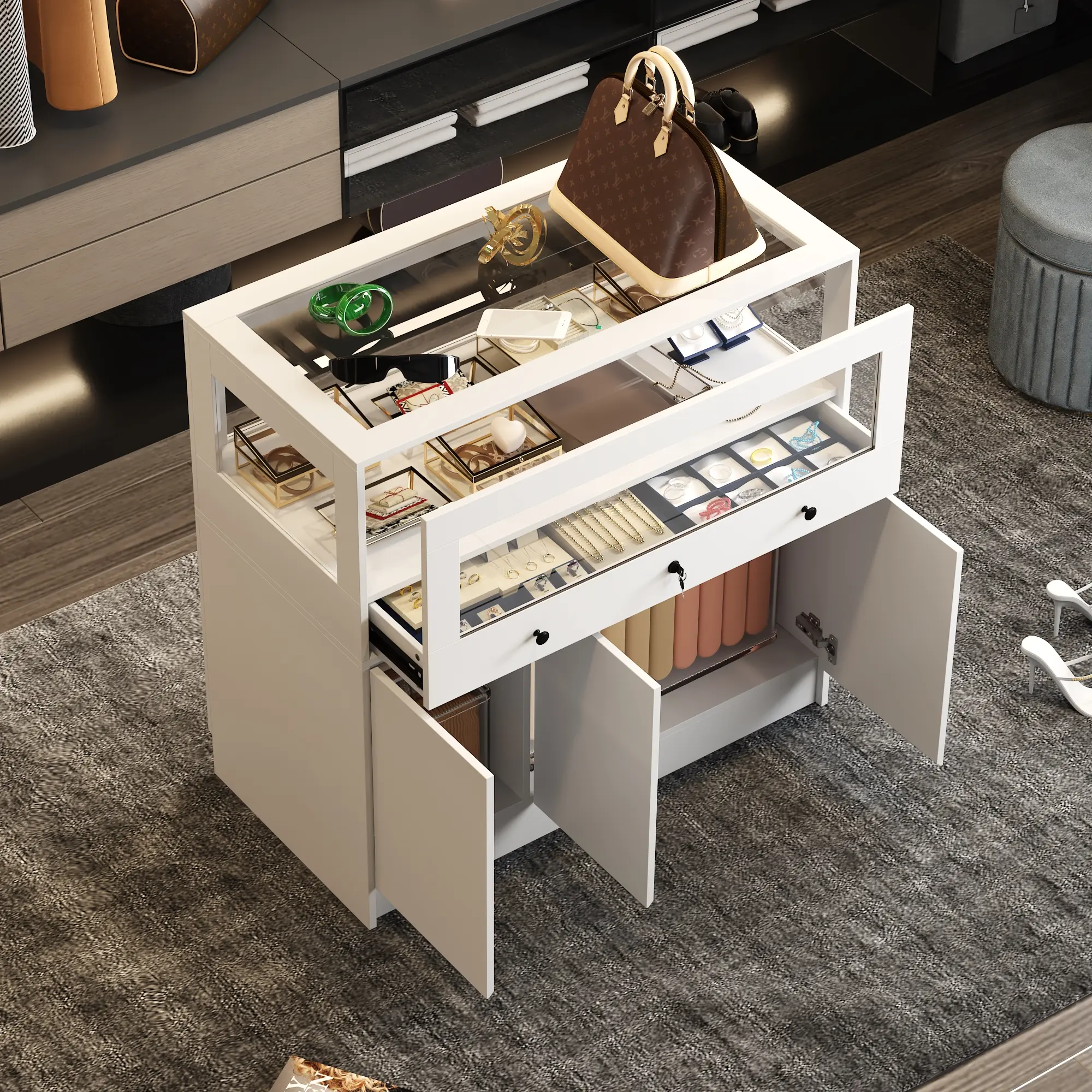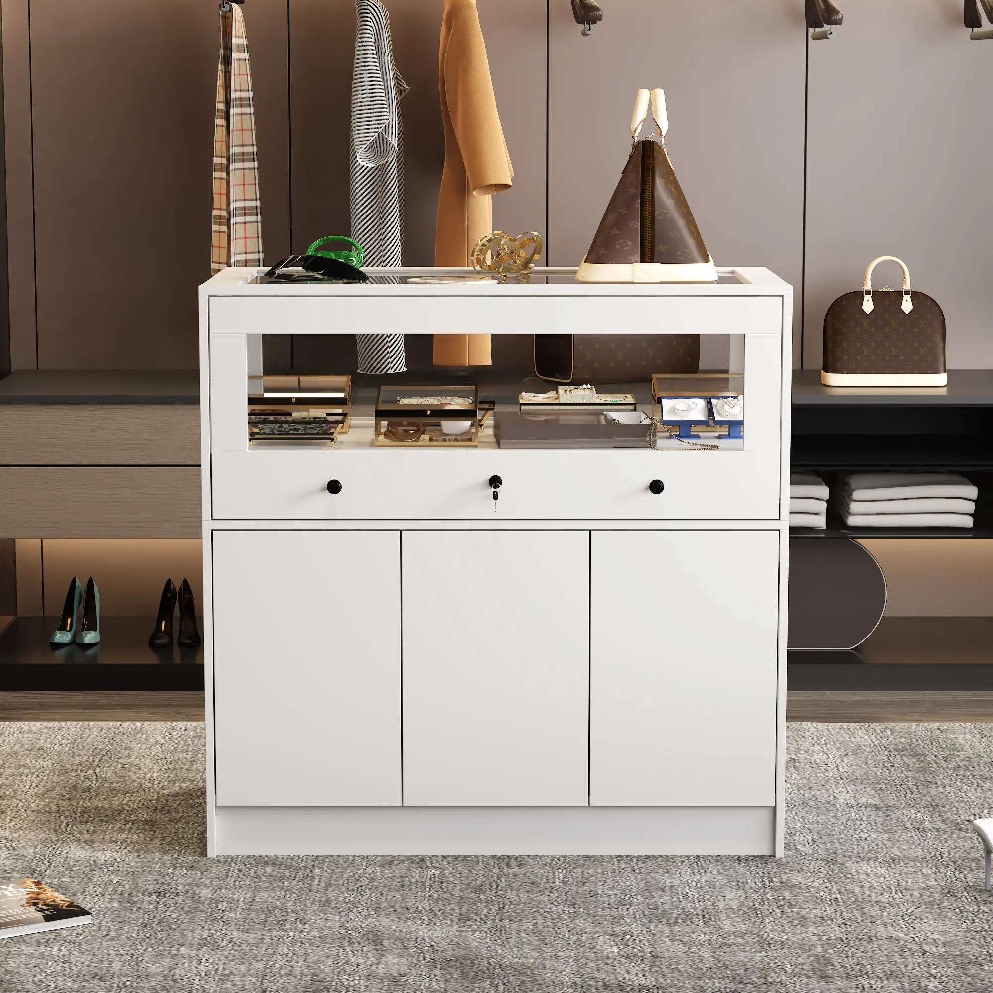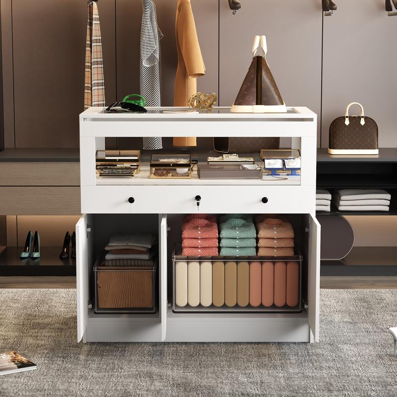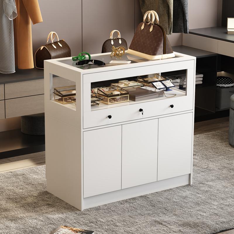 ·[Display Cabinet with Lock] Utilize the lockable upper showcase with reinforced glass for elegant display purposes, perfect for showcasing cosmetics, jewelry, and other valuables while offering the added convenience of a locking feature. Ideal for homes, shops, or offices seeking both display functionality and item protection.