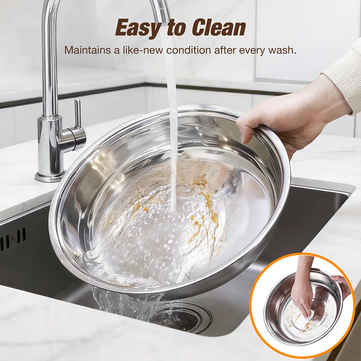 Nests neatly to save cabinet space. Mirror-polished finish resists sticking, and it’s dishwasher-safe.