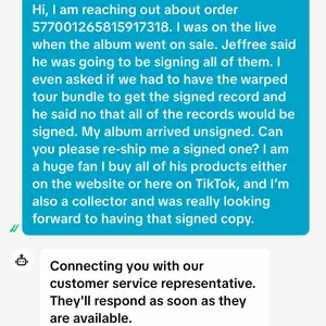 I can’t stand bad Customer Service. On TikTok JSC Offers zero customer service. I was on live when Jeffree Star started selling his warped tour items. I asked if all albums would be signed and he said yes that you did not have to buy the bundle that was being offered, he would be signing all albums. Mine arrived unsigned and I cannot get a response from Customer Service. Hence the one star. Thanks for nothing TikTok team. I buy all of the products, am a huge collector, and am majorly disappointed in JSC. The only CS Messages I get are if items are sitting in my cart, like a ton of reminders.