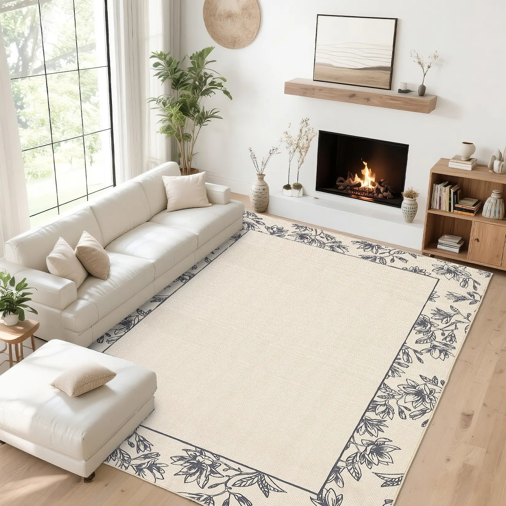 5. Washable Foldable Printed Rug, Modern Linen Border, Suits Many Domestic Spaces