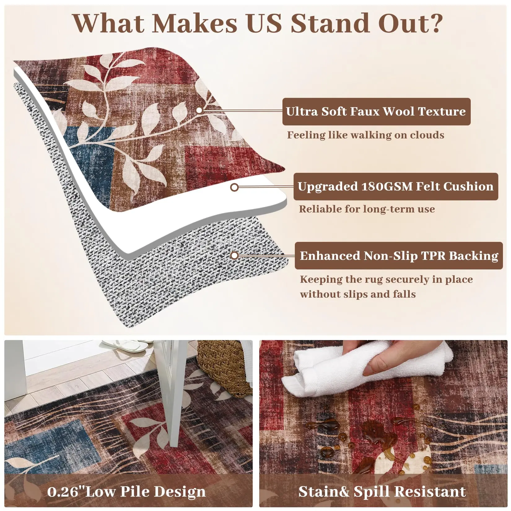 · ăLow Pile & Non-Shedding Rugă- Crafted with expertise, these area rugs feature a low pile and non-shedding construction. Machine-woven from durable synthetic fibers, they offer a plush and comfortable surface without the hassle of shedding. With a modest 0.3" pile height, they fit effortlessly in entryways, under furniture, and won't obstruct doorways. Simultaneously, the sound-absorbing effect of this rug can reduce the noise when walking, it's the best choice for your bedroom or kids room