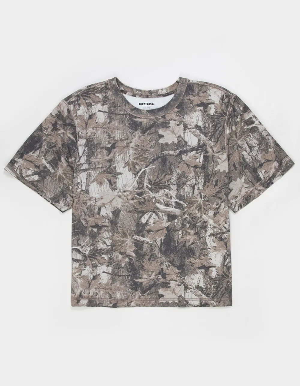 RSQ Washed Boxy Tee. Allover camo pattern. Exposed seam details. Boxy fit. Crew neck. Short sleeve. 100% Cotton. Machine wash. Imported.