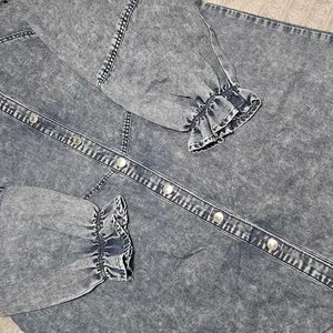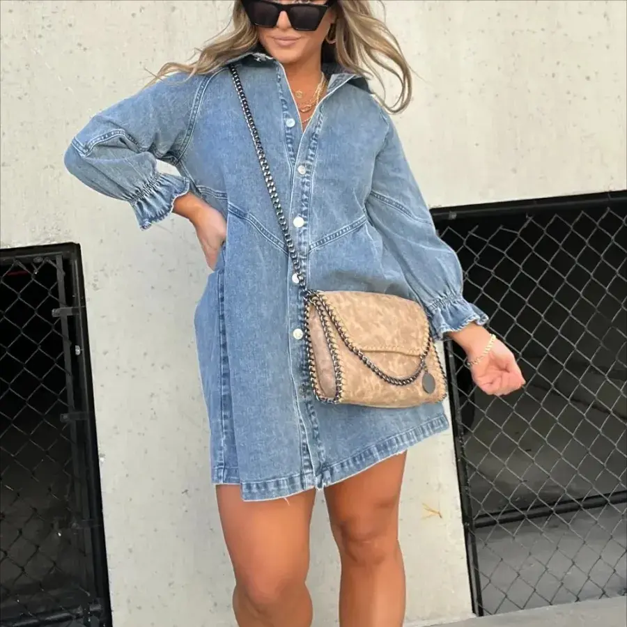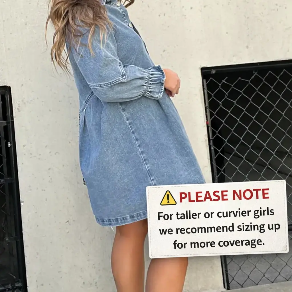 This denim dress has a shorter skirt length and Semi-balloon 3/4 sleeves.