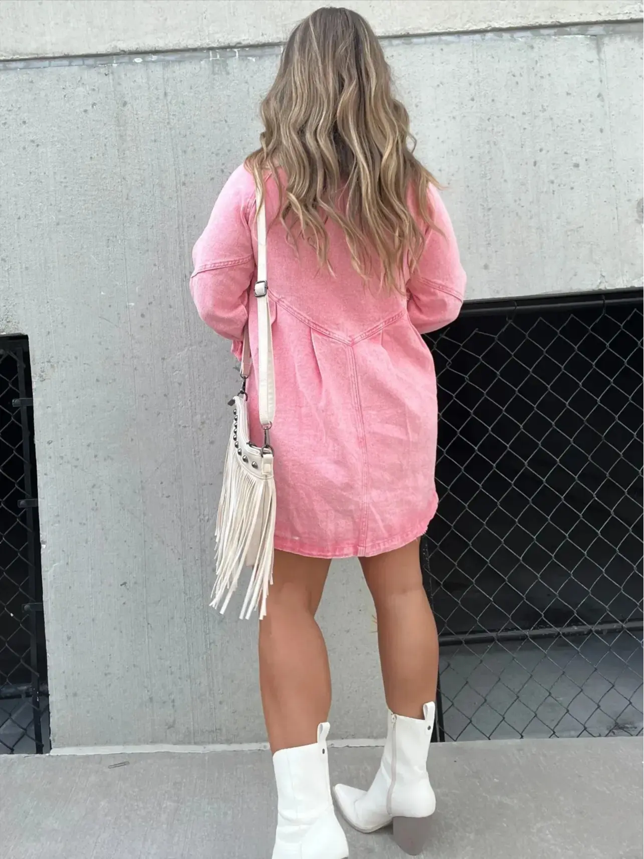 The fabric is on the thinner side, so we recommend pairing it with a jacket and boots for fall/winter.