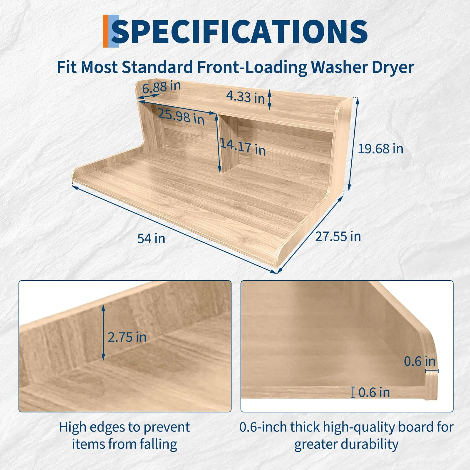· 【2.75"High Edge Rails】--Our washer and dryer countertop features 2.75"high rails to prevent detergent bottles, baskets, and other items from falling. The rounded edges of the countertop minimize the risk of injury from sharp corners, ensuring a safer and more reliable user experience.