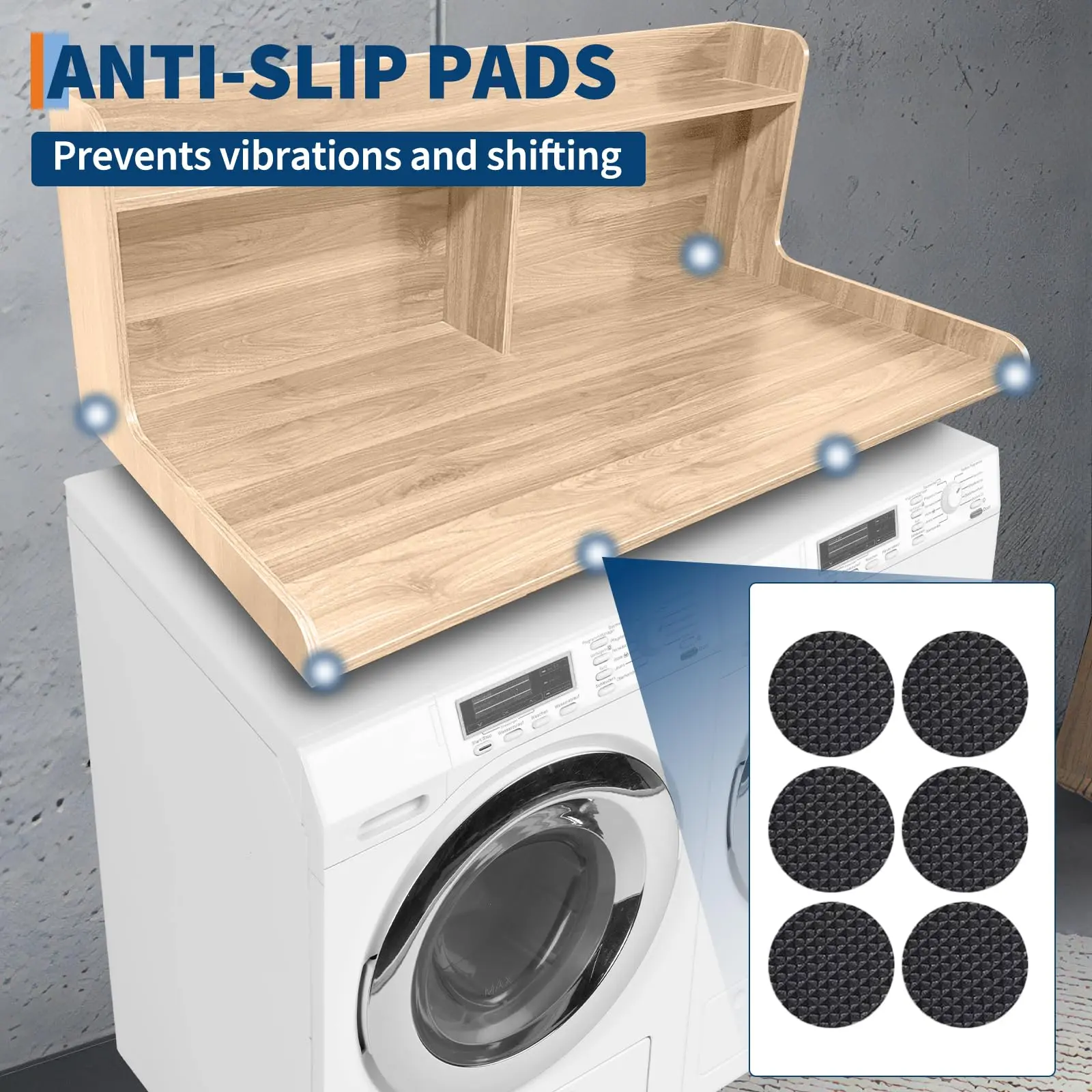 · 【Premium Material】--Crafted from 0.6-inch thick wood board with waterproof coating, this washer dryer countertop is heat-resistant, rust-resistant, water-resistant, and easy to clean. Equipped with the non-slip pads on the bottom to reduce vibration during operation, allowing items to be placed more stably and not easily tilted.
