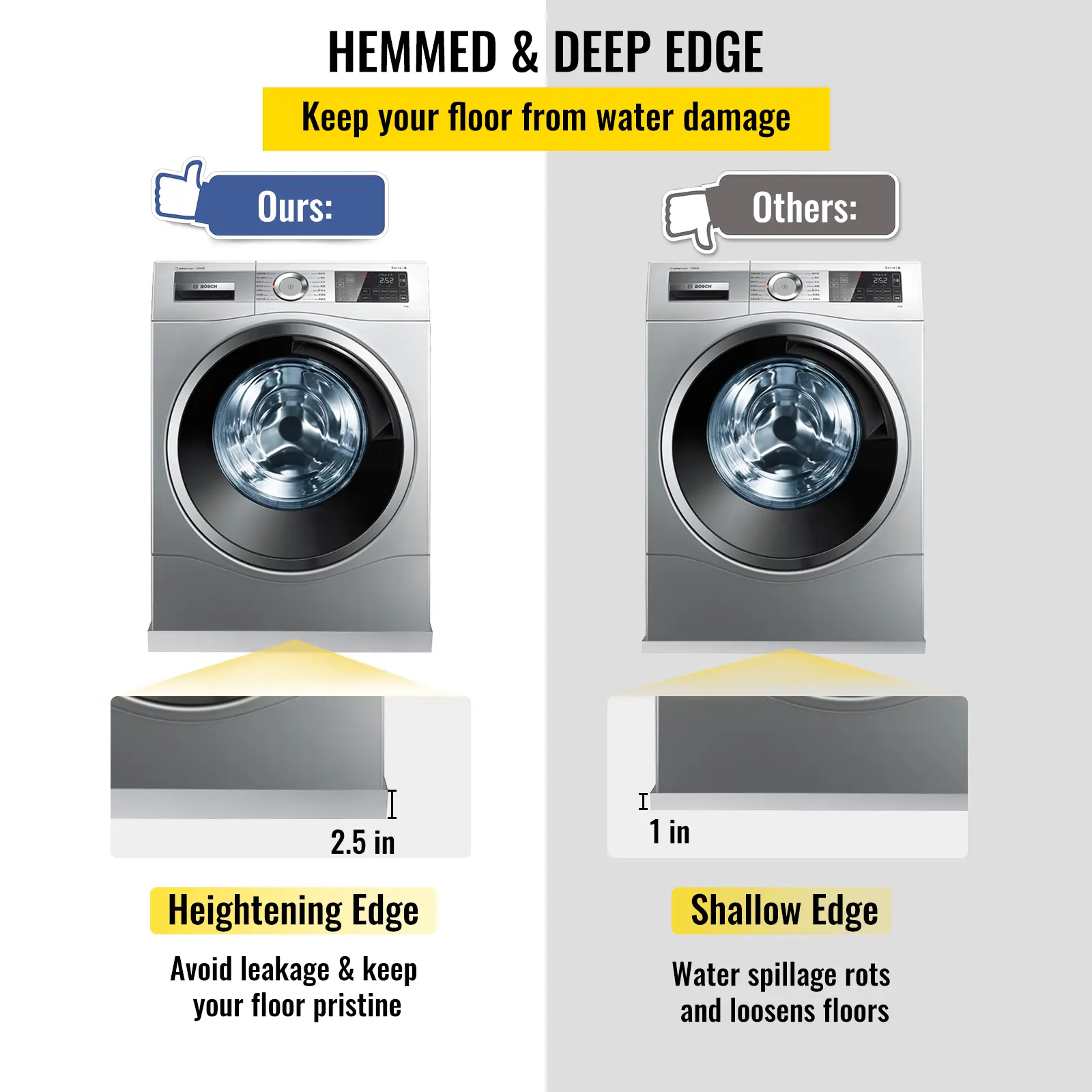 • Welded & Heightening Edge: A leaking washing machine will impose risks and threats. If a hose leaks or ruptures, it will release gallons of water per hour. Once you finally detect the leak, it might cost a significant amount to leverage the situation. Our 2.5-inch high-edge design will eliminate your concerns, avoid leaks, and keep your floors clean and dry.
