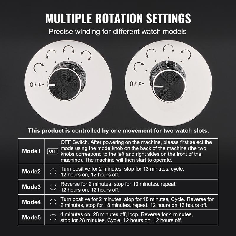 • Precise Knob Adjustments: Different watch brands and models have different winding requirements. To accommodate a wide range of mechanical watches, we've designed multiple winding modes, including clockwise, counterclockwise, alternating, and intermittent rotations. Combined with independent speed control, the dedicated knobs ensure both reliability and precise timing for your watches.