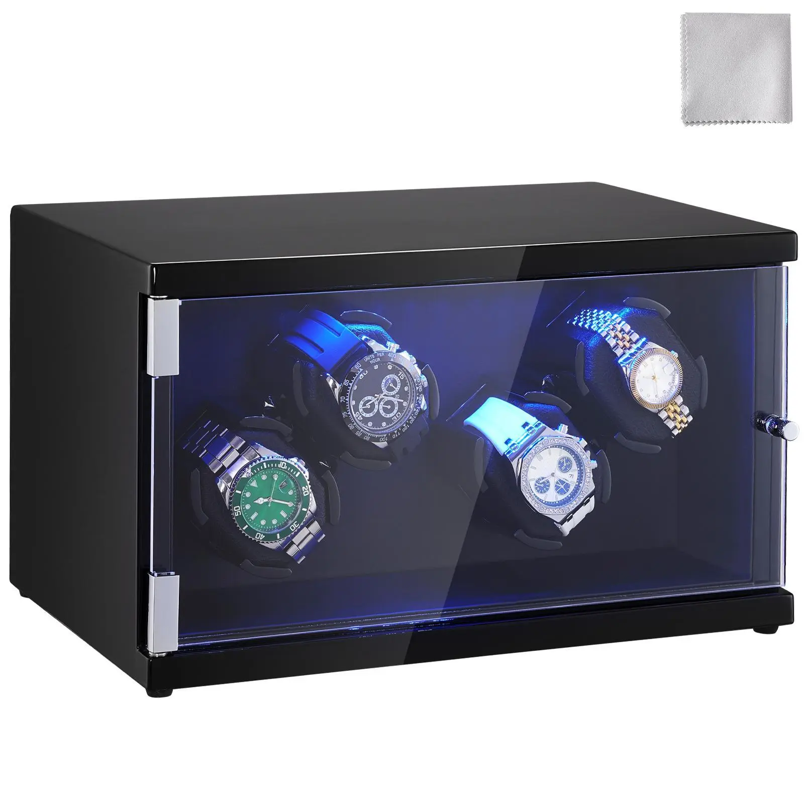 • Practical Details: Our watch box winder features elastic watch pillows, accommodating watches with various strap lengths. The user-friendly open-lid stop function prevents unnecessary wear on the mechanism while allowing easy access to your watches. The LED blue light adds a touch of luxury, perfect for display and nighttime illumination. With two power supply modes, it's convenient for both home use and portability.