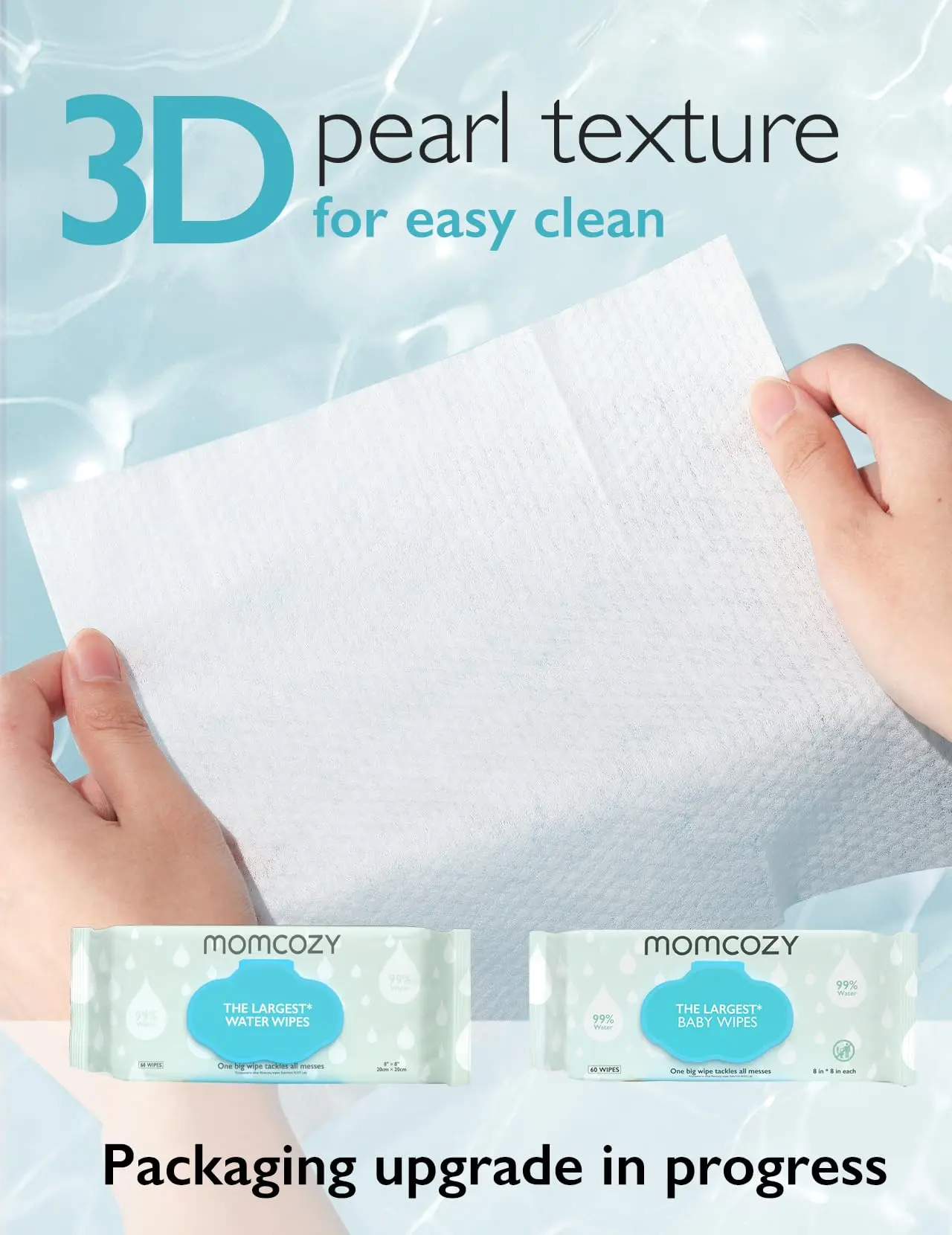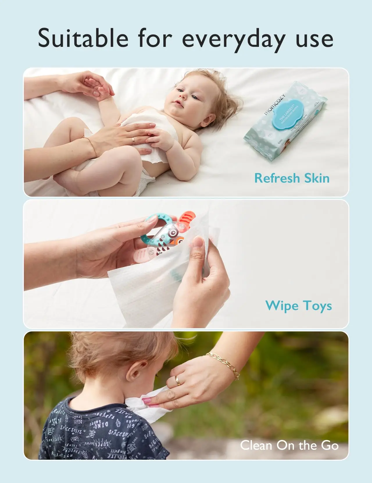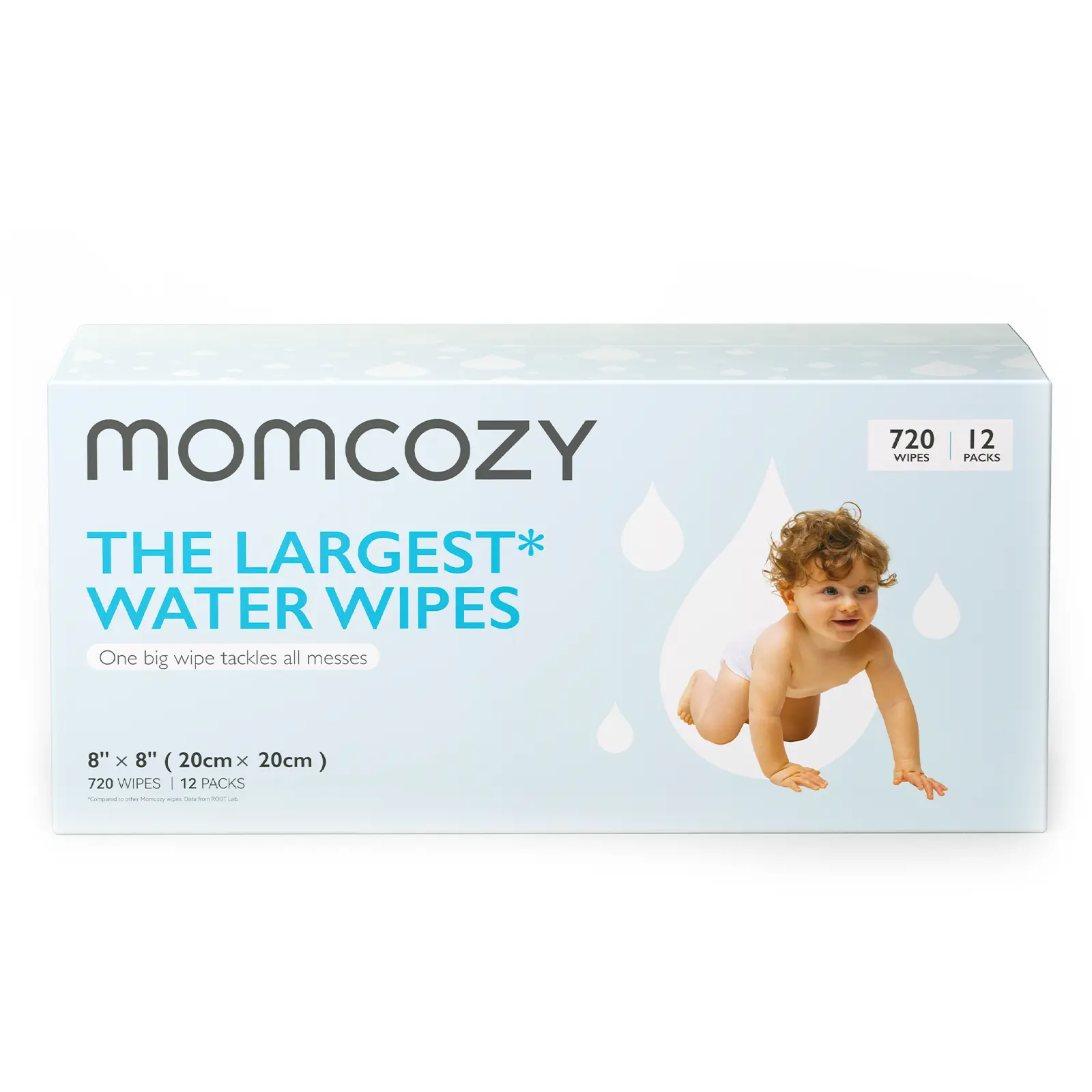 ·ăOne Wipe, All Messes Gone ă25% larger than other regular water baby wipes, our 8'' x8'' wipes easily handle any messes for everyday occasions, from little messy butts to heavier duties. It's a real game-changer for moms and their little ones!