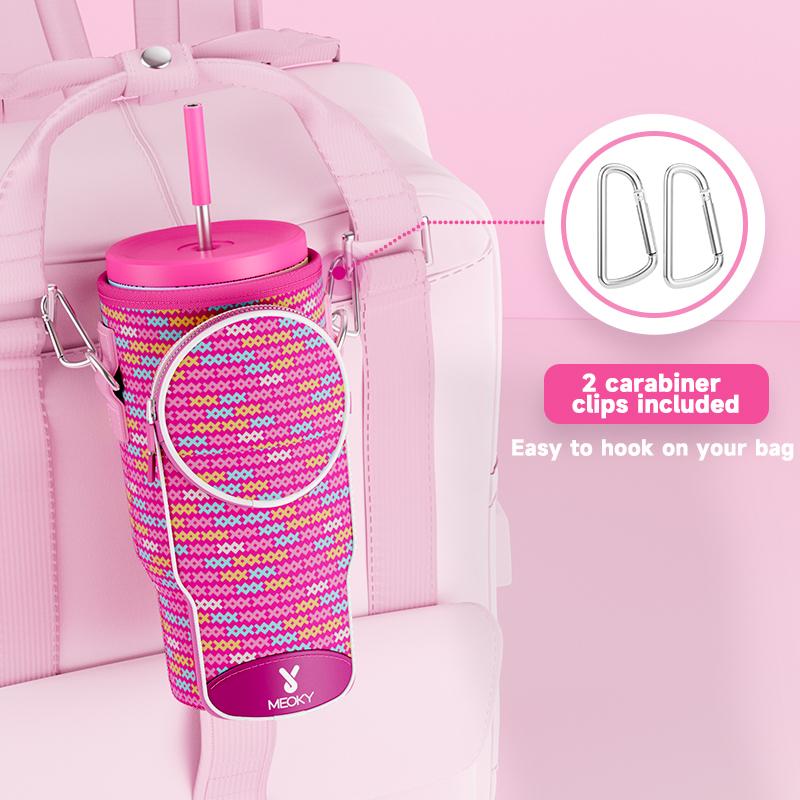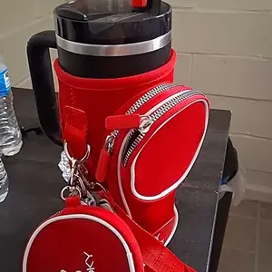 This tumbler carrier is absolutely adorable. I was second guessing that I might be buying something unnecessary. This is an awesome buy and I am so glad I did. It comes with a little coin pouch on the strap and the carrier itself also has very practical two zippered compartments.