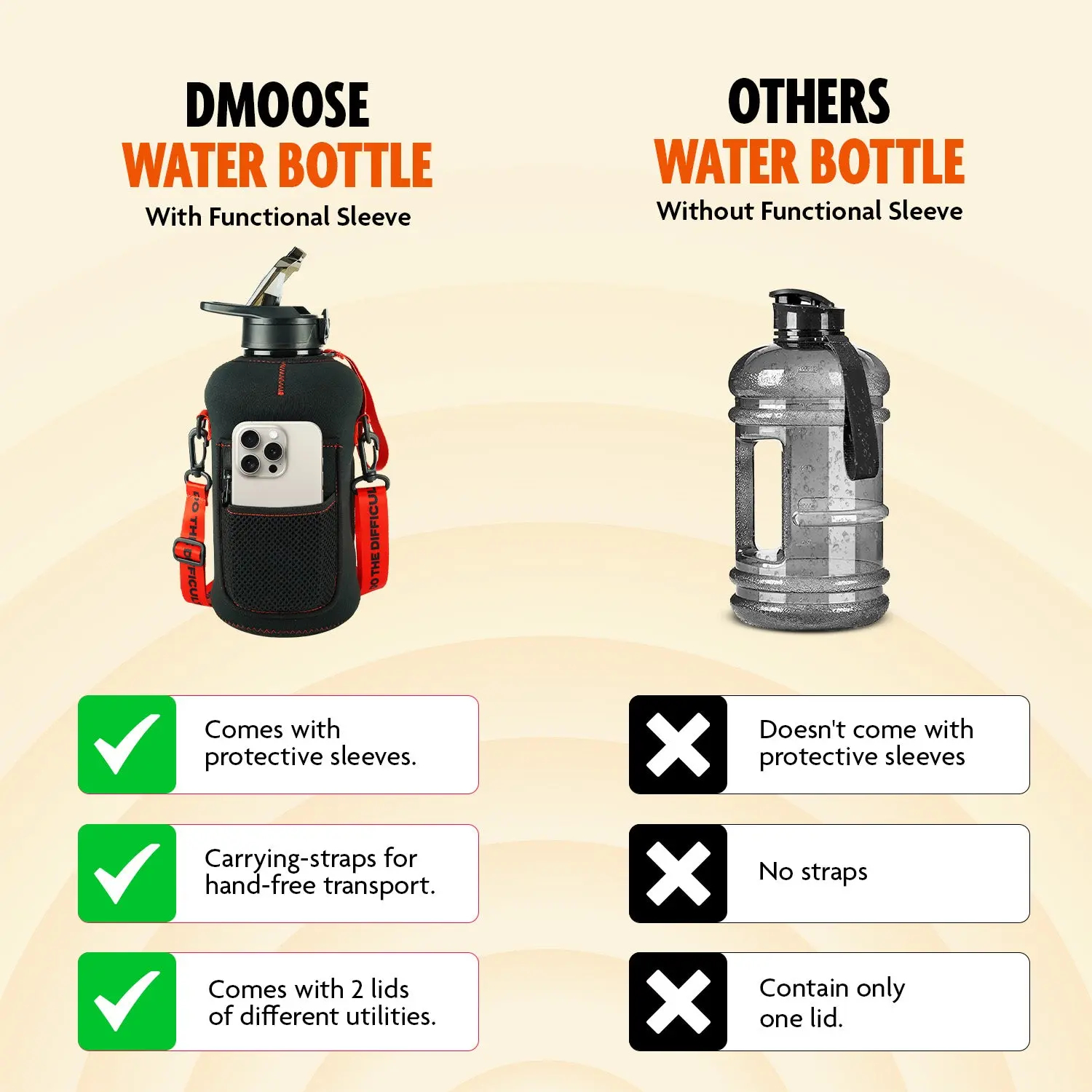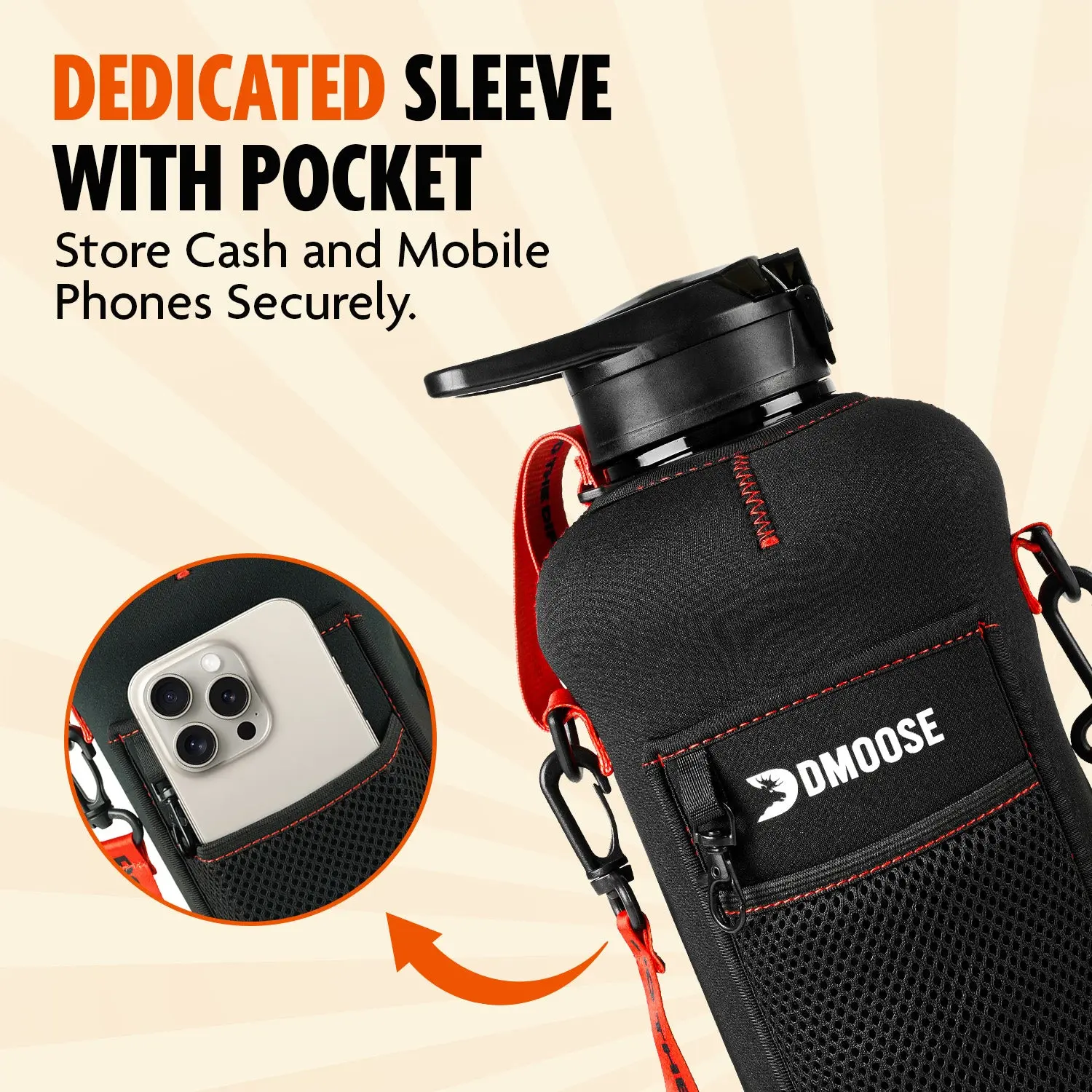 Struggling to stay hydrated or manage essentials during workouts? The DMoose Water Bottle with Sleeve has you covered! With a 2.2L capacity, it keeps you hydrated through long sessions. Its BPA-free design ensures safe drinking, and the sleeve features handy pockets to securely store your cash, phone, and more. Stay focused, stay organized!