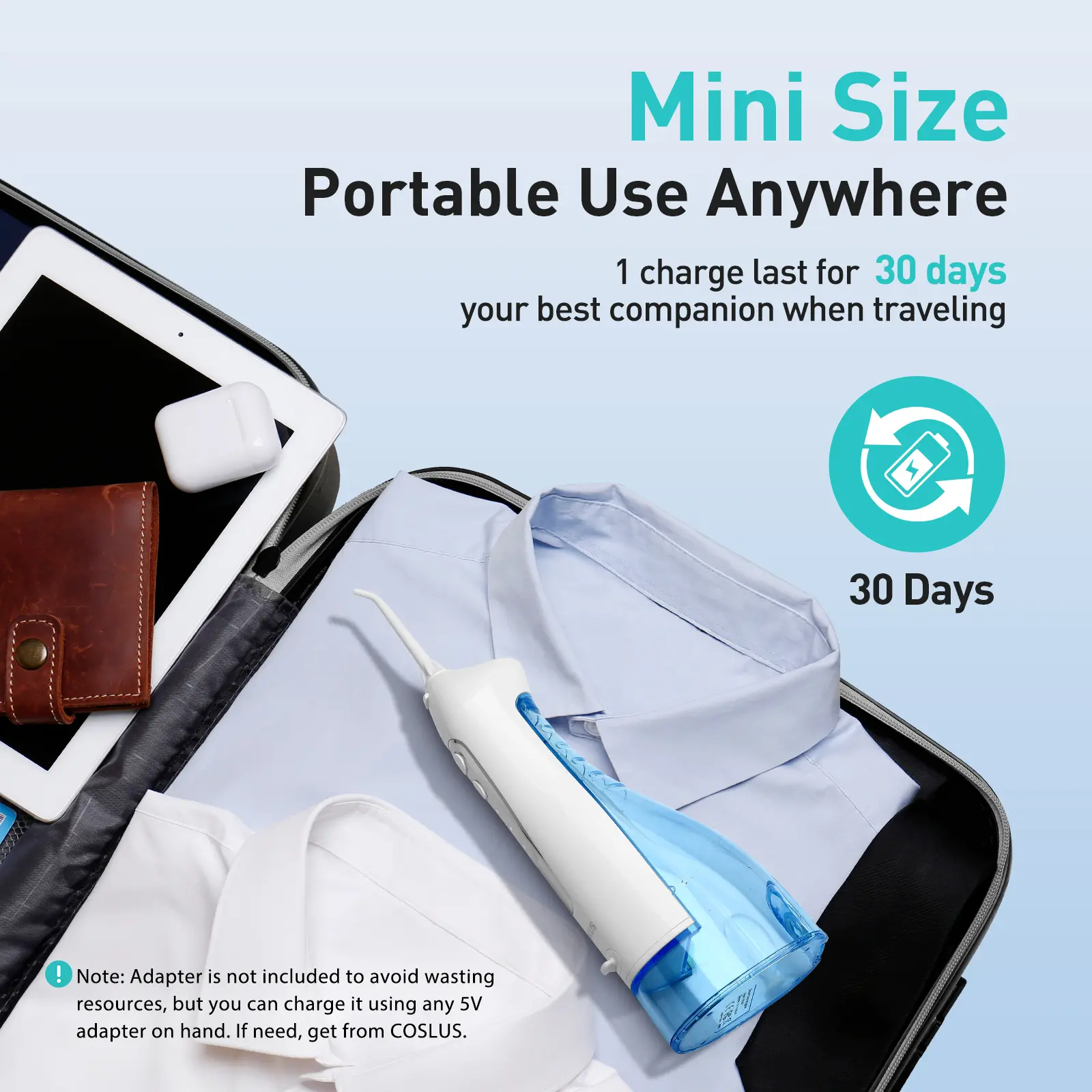 The Coslus CX20 Water Flosser with a high-capacity built-in battery, just 3.5 hours of charging provides up to 30 days of continuous use. The lightweight design and USB charging make it perfect for home or travel, ensuring oral health is always within reach.