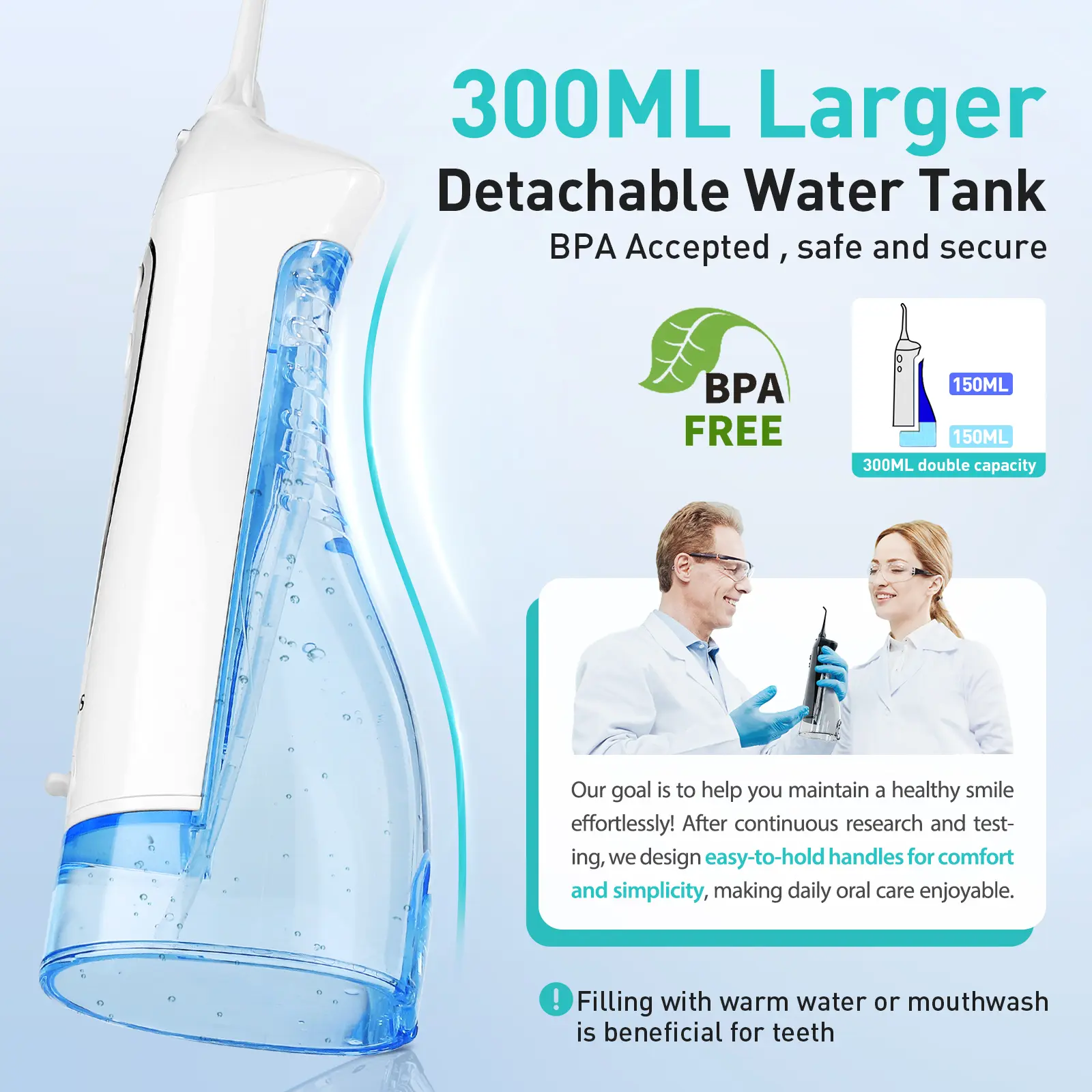 The upgraded extra-large water tank allows for a complete cleaning session with just one fill, eliminating the need for frequent refills and making the oral care process smoother and more time-efficient.