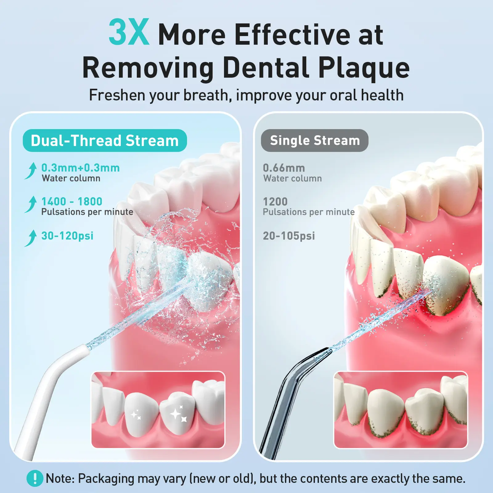 The Coslus CX20 Water Flosser featuring 0.3mm+0.3mm dual-thread high-frequency pulse technology, it delivers 1500-1850 high-pressure water pulses per minute, effortlessly rinsing away hidden plaque and achieving deep cleaning that manual brushing can't reach.