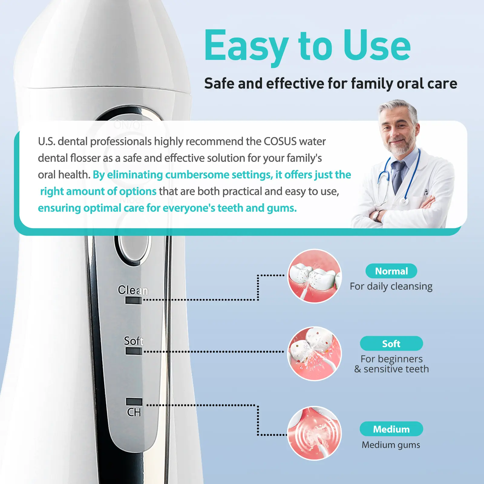 The Coslus CX20 Water Flosser equipped with multiple cleaning modes and pressure settings, it can be freely adjusted according to individual oral conditions. Whether for sensitive gums, orthodontic care, or daily cleaning, you can find a gentle and effective solution tailored just for you.