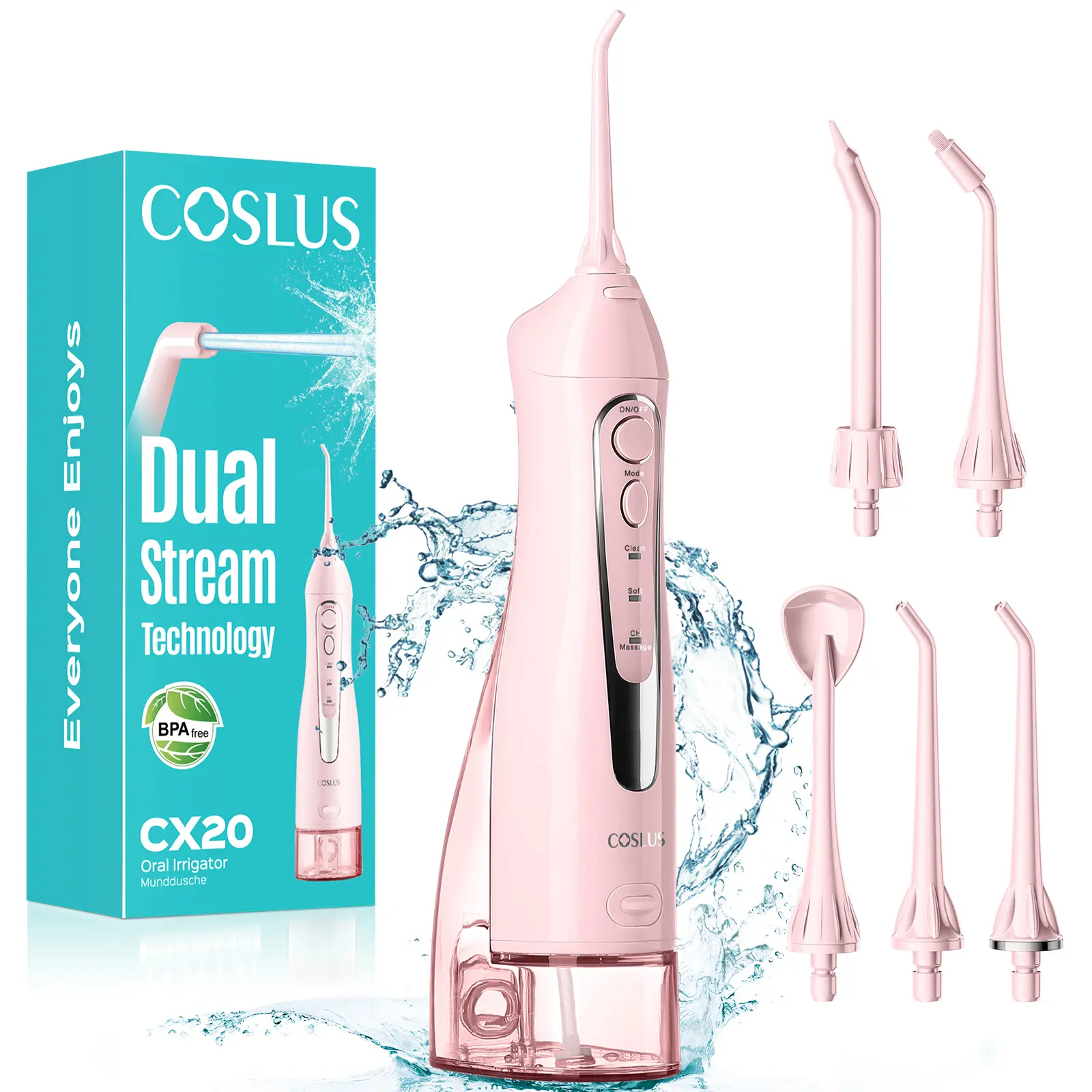 The Coslus CX20 Water Flosser rated IPX7 waterproof, it can be safely used even in the shower. The robust core motor is built to last, backed by a 2-year reliability promise. Paired with 5 professional nozzle tips, it meets the diverse needs of the whole family.