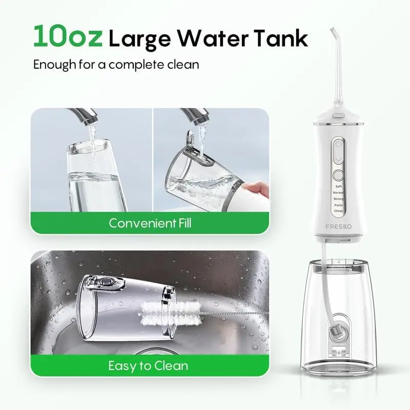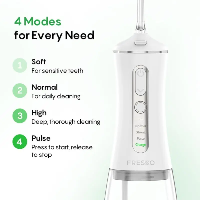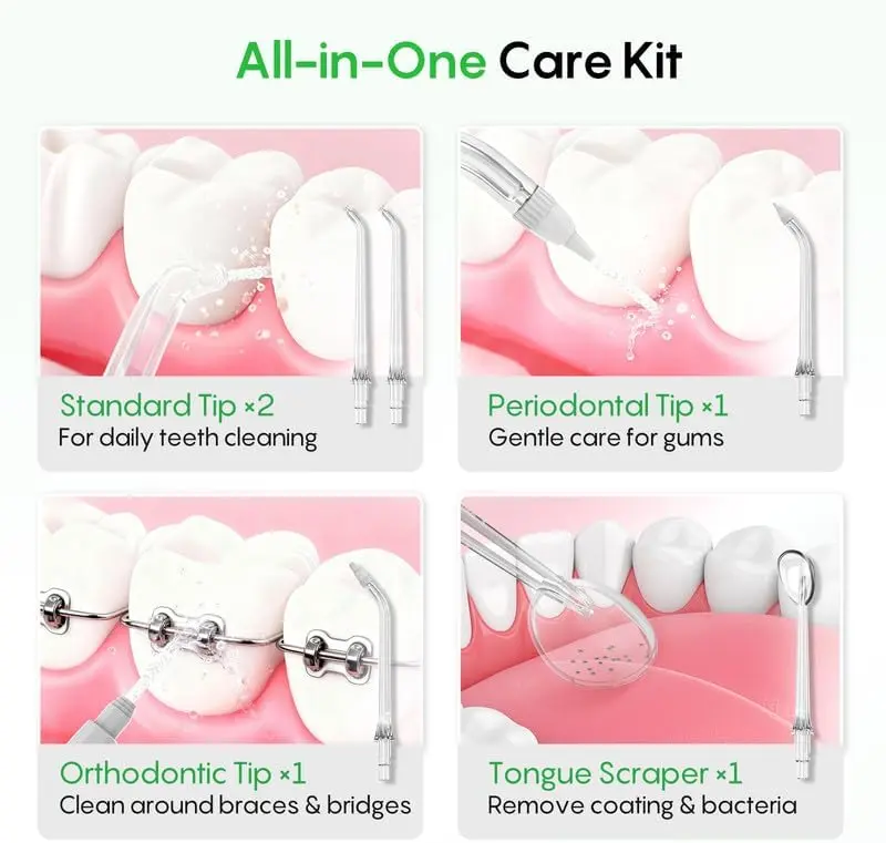 ·4 Modes & Comprehensive 5-Tip Kit: Customize your flossing with Soft, Normal, Strong, and Pulse modes for any sensitivity level. Kit includes 5 professional tips: 2 Standard, 1 Periodontal (for pockets), 1 Orthodontic (for braces), and 1 Tongue Scraper, meeting the diverse needs of the entire family.